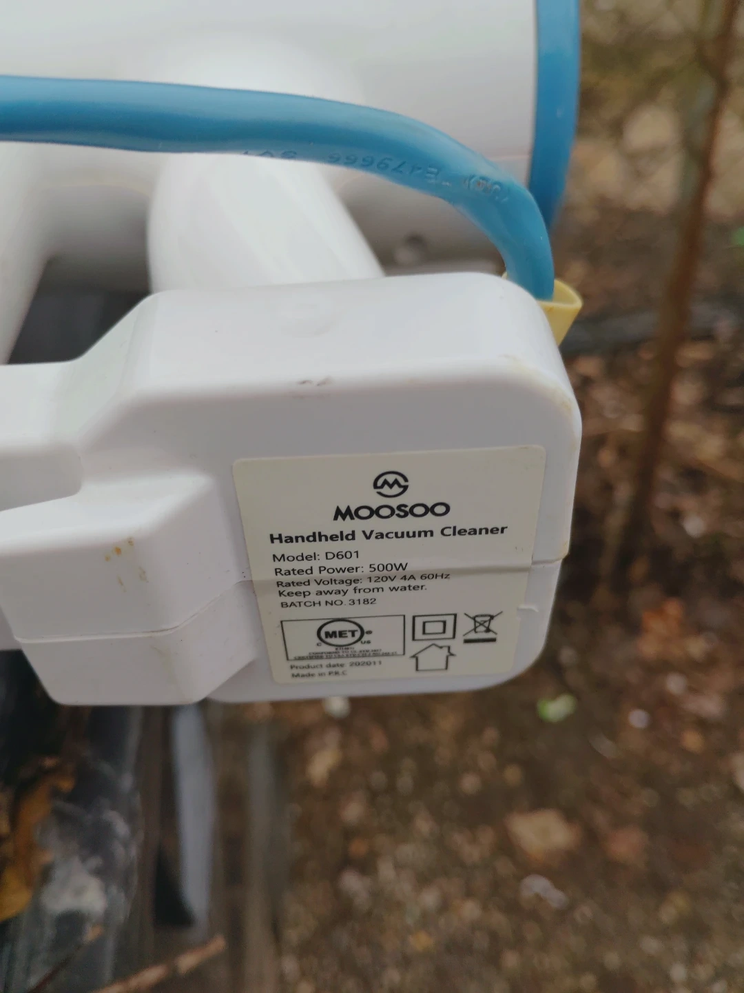 This MOOSOO handheld vacuum cleaner is a Model D601. It has a 500W rated power and operates on 120V at 60Hz. It's designed for dry use only.