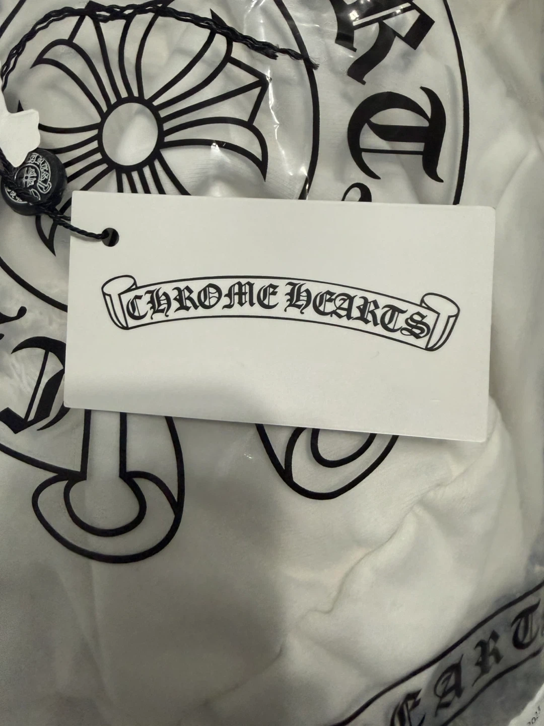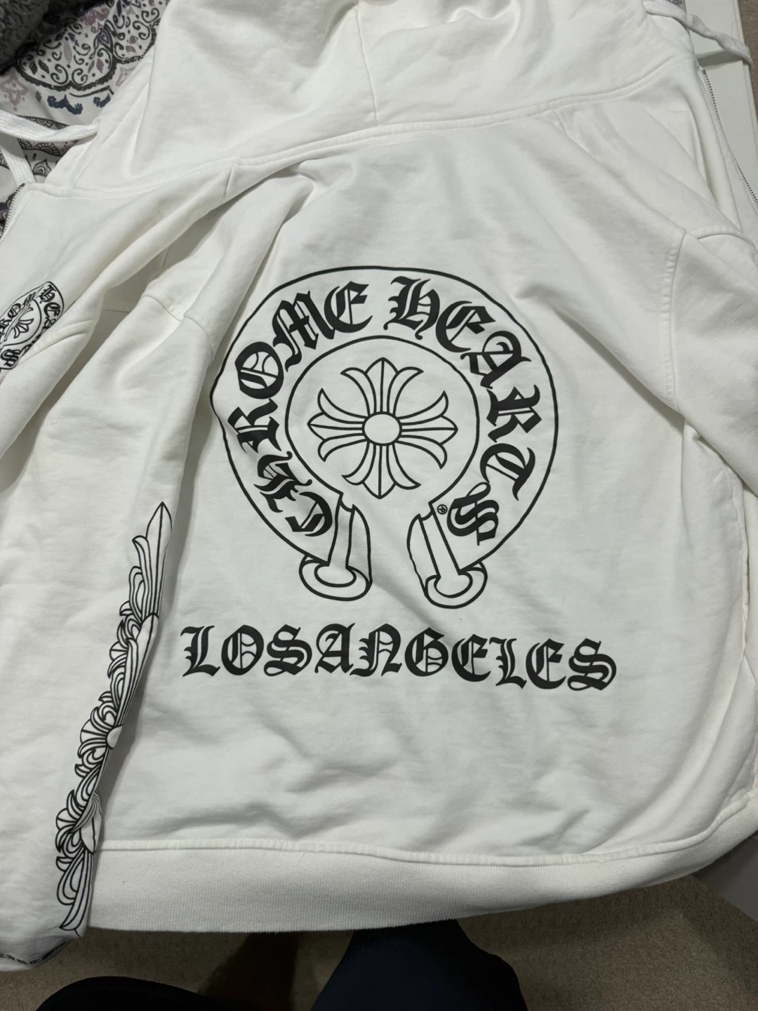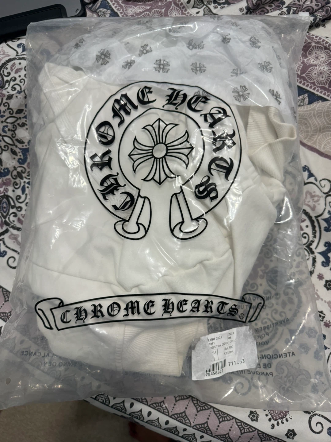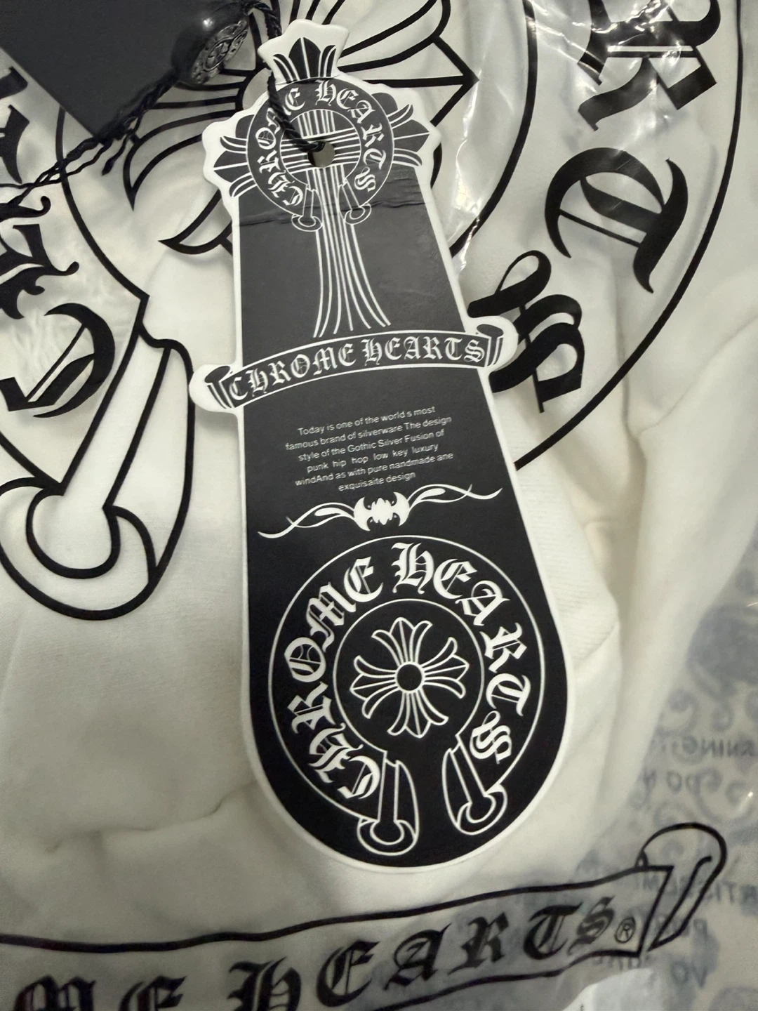 This is a brand new, white Chrome Hearts hoodie still in its original packaging. It features the iconic Chrome Hearts branding and zipper pull. Made of cotton.
