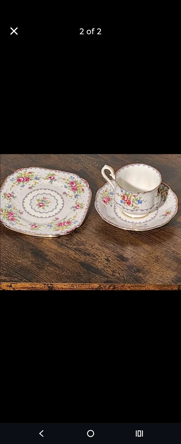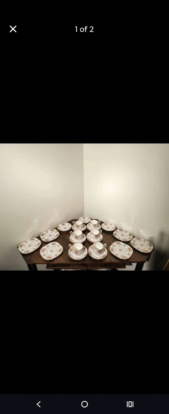 This is a lovely Royal Albert Bone China tea set, featuring a beautiful floral pattern. It includes cups, saucers, and side plates. It's perfect for hosting a delightful afternoon tea!