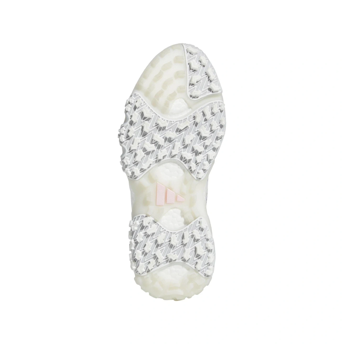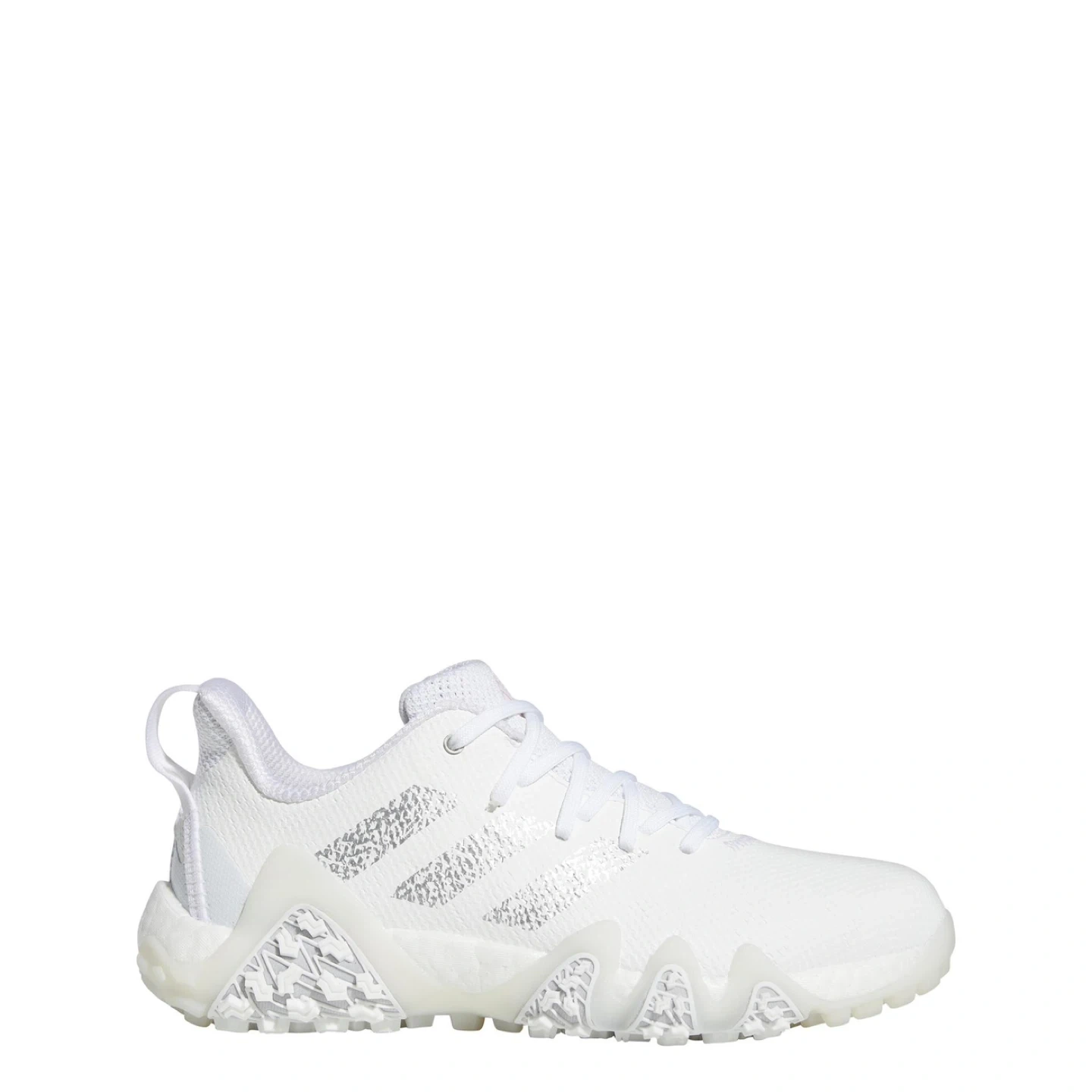 These Adidas golf shoes are white with silver accents and pink detailing. They feature a mesh upper and a durable outsole for traction on the course. These shoes are designed for women.