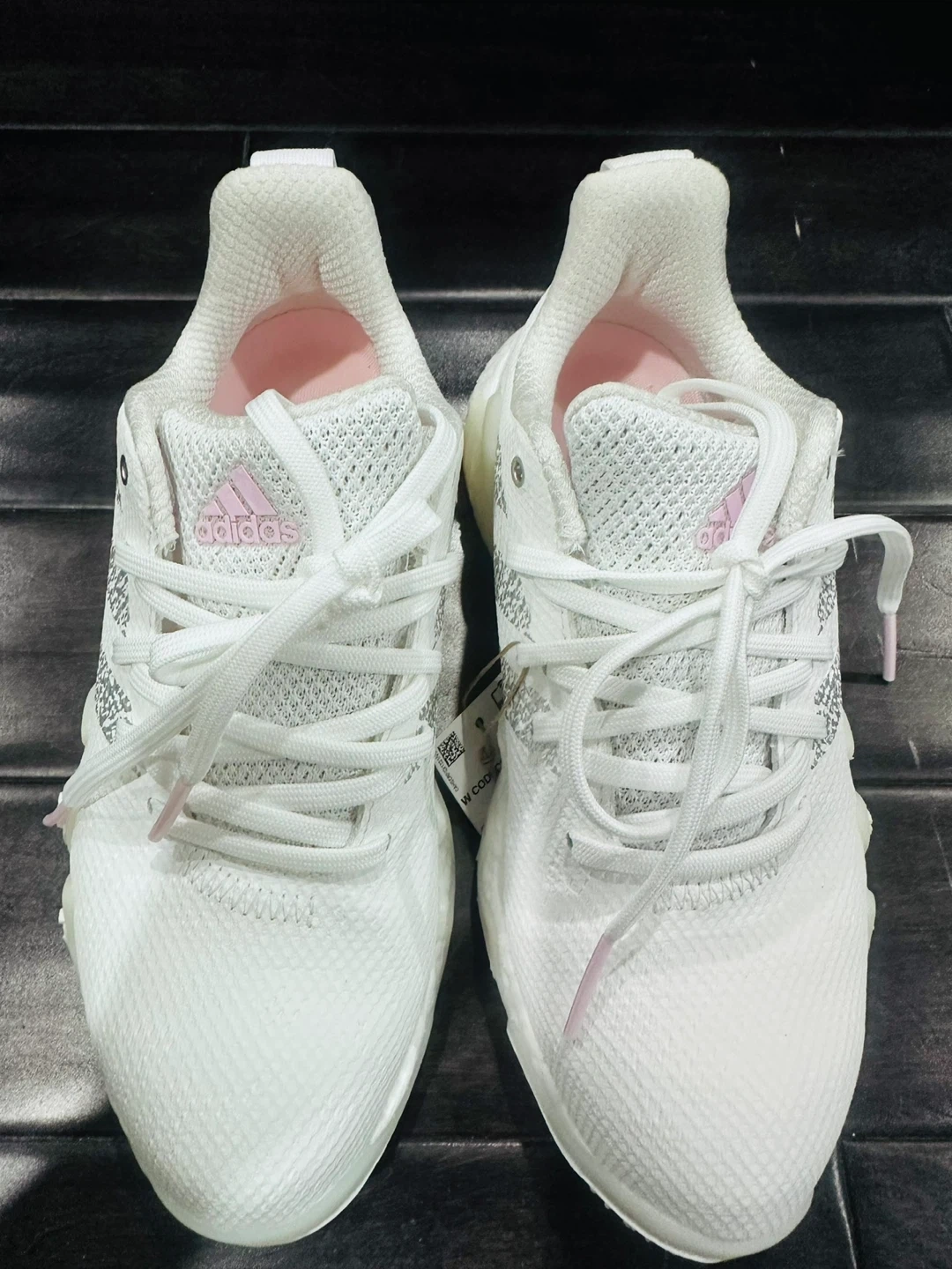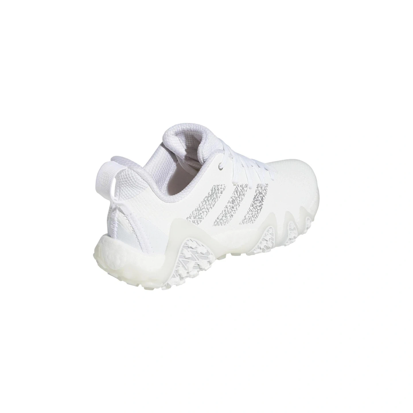These Adidas golf shoes are white with silver accents and pink detailing. They feature a mesh upper and a durable outsole for traction on the course. These shoes are designed for women.