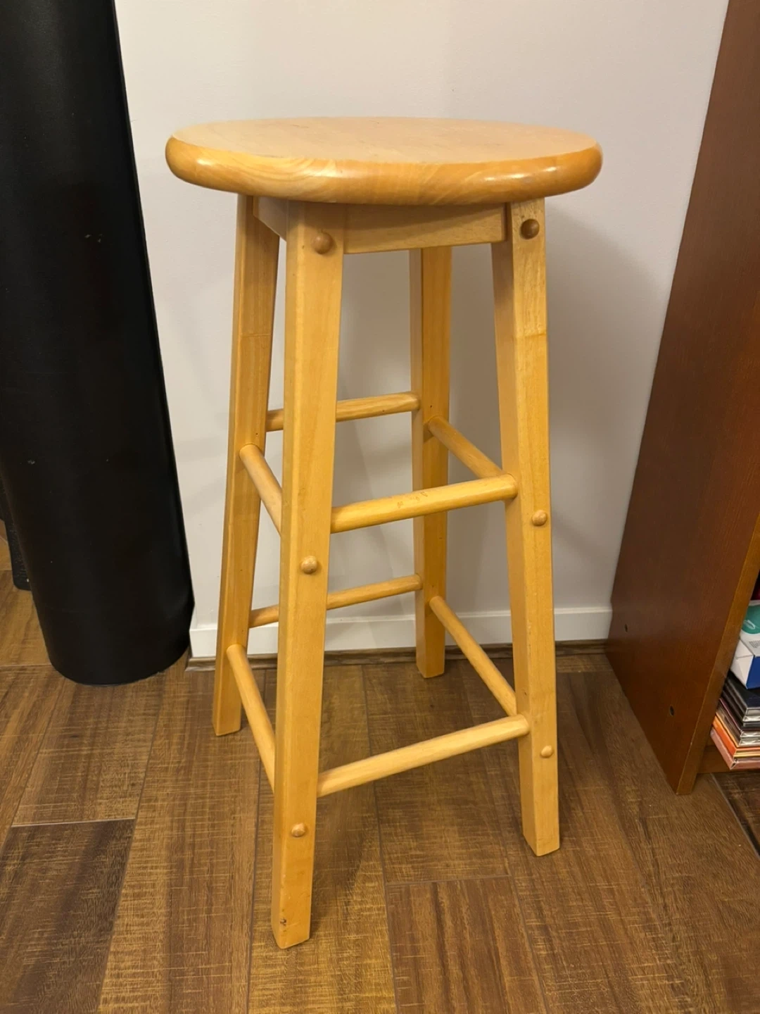 Selling a wooden bar stool. It's in good condition and ready for a new home! The stool is made of light-coloured wood and has a classic design. Perfect for your kitchen or bar area