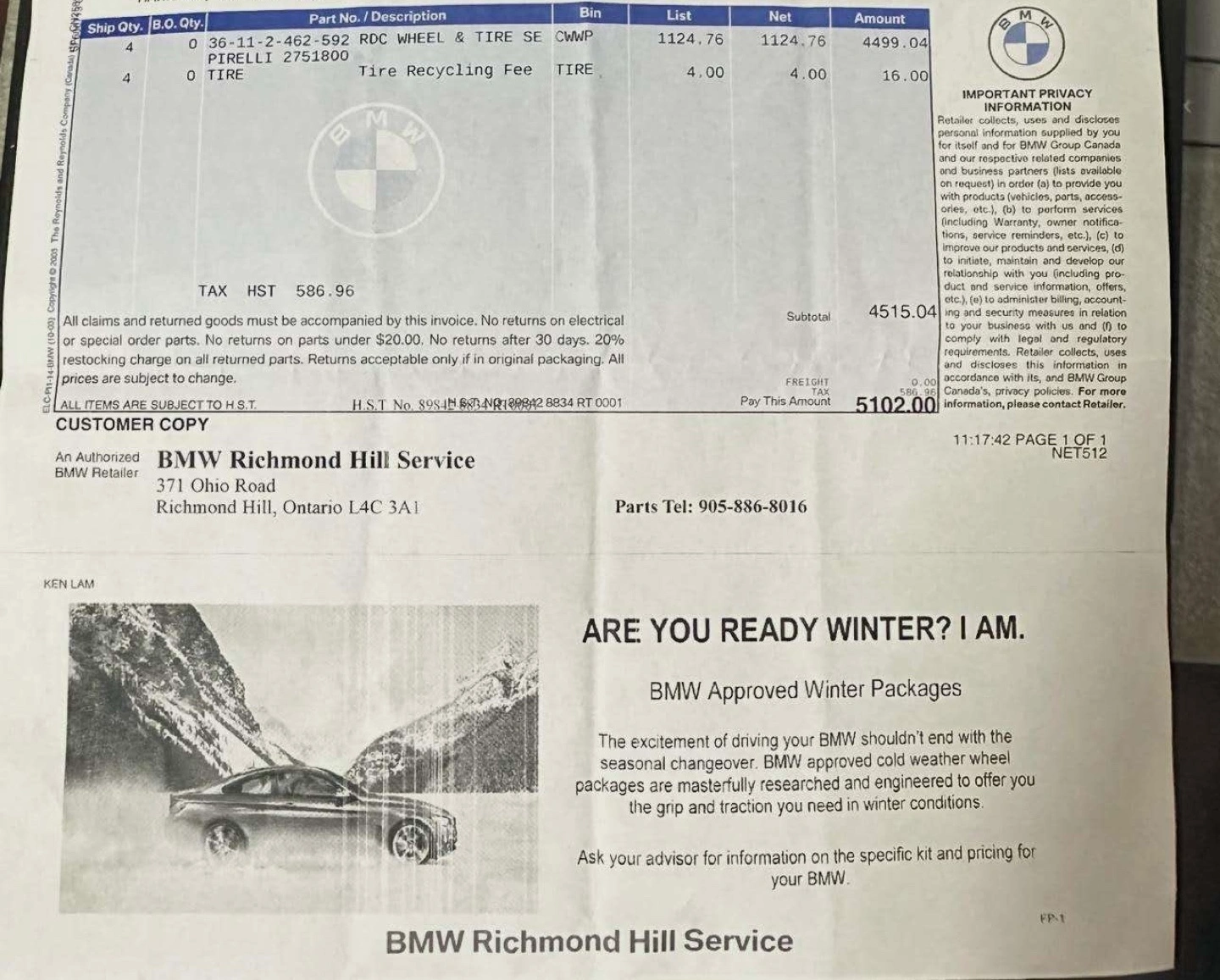 12Selling a complete OEM BMW winter tire & rim set from my 2023 BMW X5 π π Tires: Pirelli Scorpion Winter Run-Flat 265/50R19 (BMW β Certified) π DOT: 5021 π Tread depth: 5.7mm (new ~8mm) π Rims: Genuine BMW, no scratches, like new π’ Always stored at BMW dealership π° Original cost: about $5000 CAD πΈ Includes invoice photo & tread depth video Used only two winter seasons, very low mileage. Selling because I upgraded to a new car. β OEM BMW rims β Run-flat tires β Excellent condition β Ready to mount β No repair history β Includes 4 original TPMS sensors π Pickup near Markville Mall, Markham π΅ Asking $2200CAD (OBO)