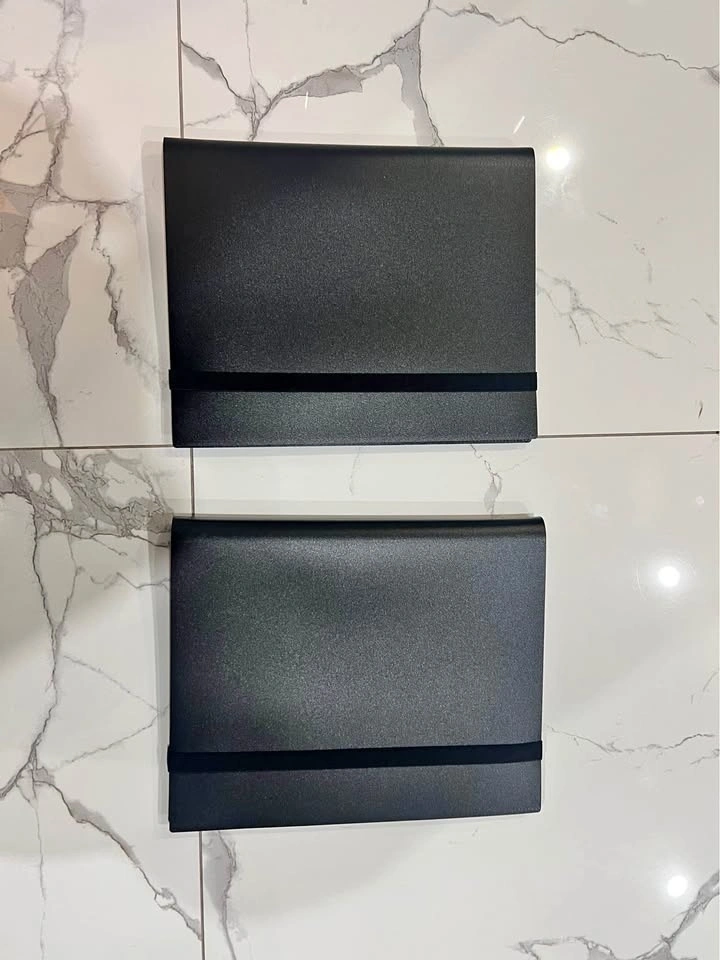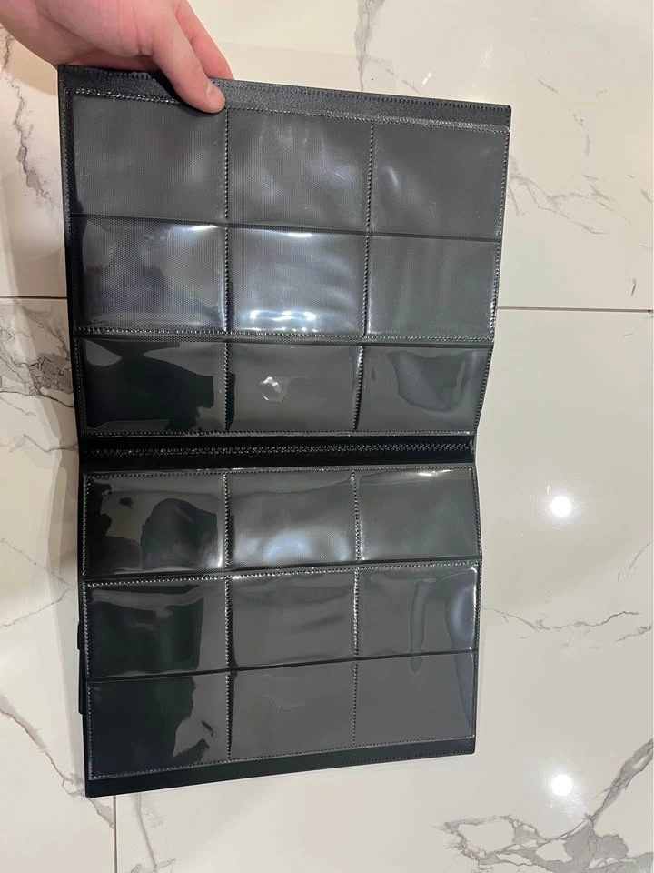 Clean set of 2 black card binders. Has clear plastic sleeves inside perfect for trading cards, sports cards, or photo cards. Each binder has an elastic strap to keep it securely closed.