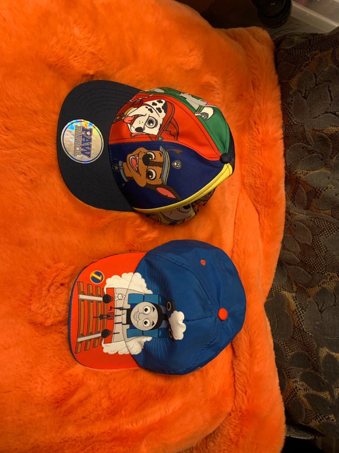 Two kids' baseball caps featuring Paw Patrol and Thomas the Train designs. One cap is navy with Paw Patrol graphics, and the other is blue with a Thomas the Train front panel. They're great for sunny days!