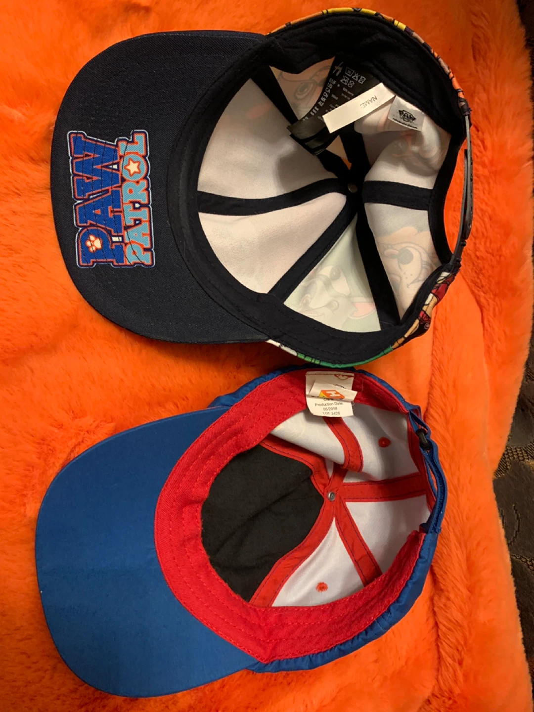 Two kids' baseball caps featuring Paw Patrol and Thomas the Train designs. One cap is navy with Paw Patrol graphics, and the other is blue with a Thomas the Train front panel. They're great for sunny days!