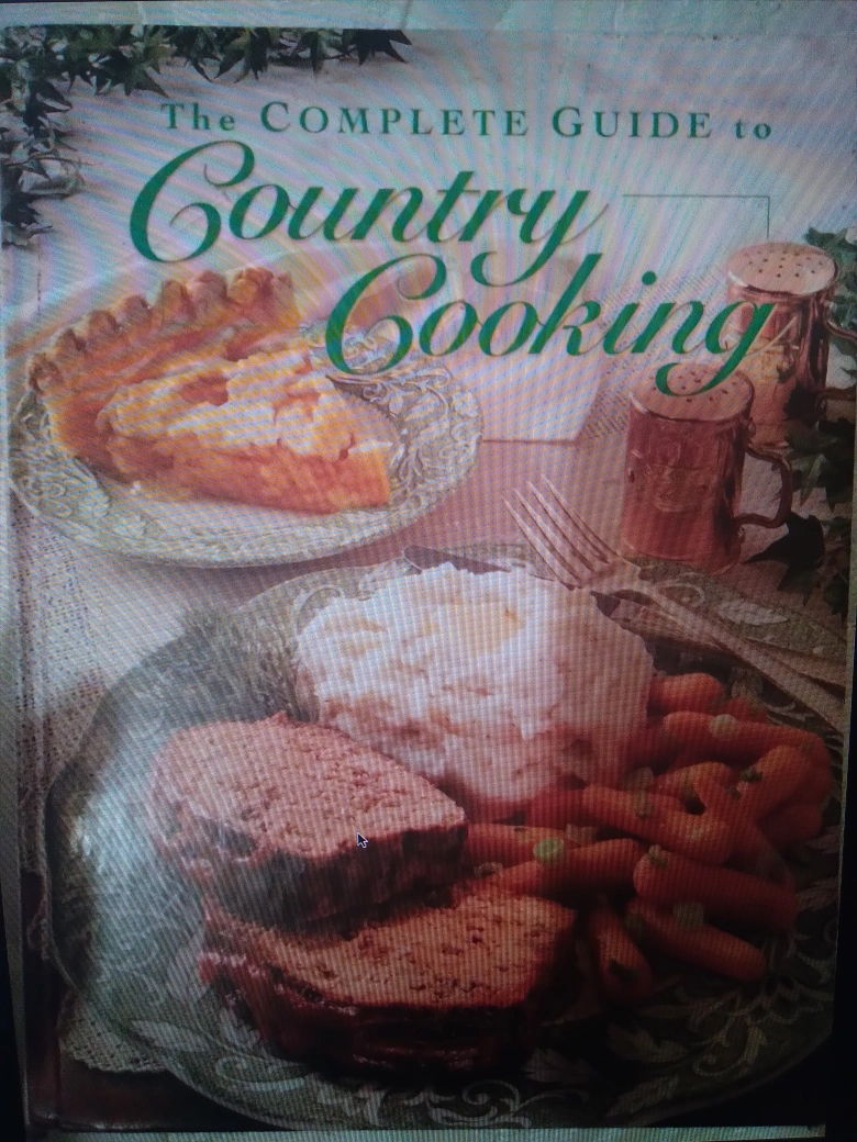 Cookbook features recipes for country cooking. Shows meatloaf, mashed potatoes, carrots, and pie and other wonderful recipes!