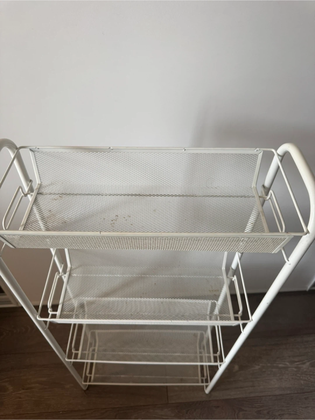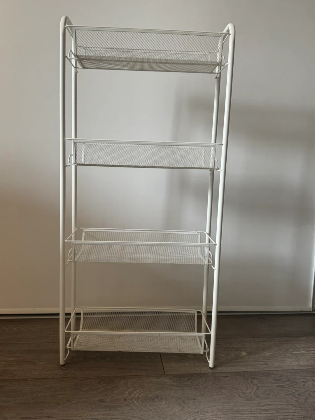 This handy 4-tier storage cart is perfect for organizing your home! It features a slim design with mesh baskets to keep items visible and ventilated. Made of metal with a white finish.