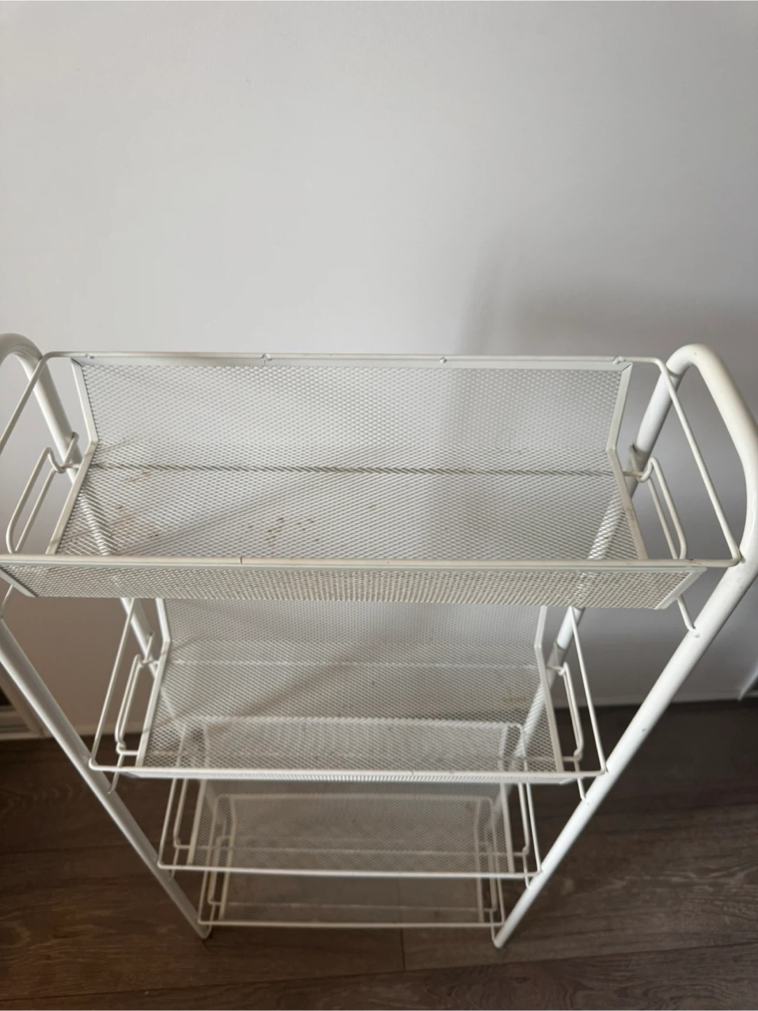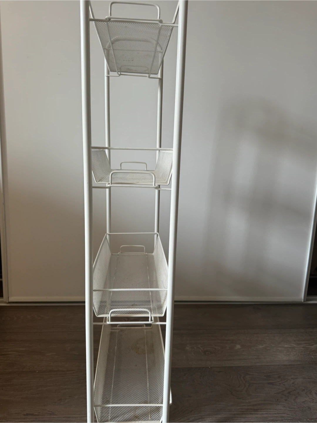 This handy 4-tier storage cart is perfect for organizing your home! It features a slim design with mesh baskets to keep items visible and ventilated. Made of metal with a white finish.