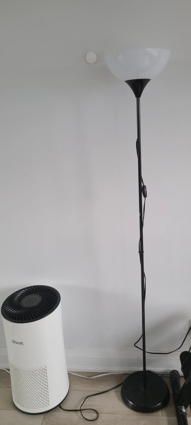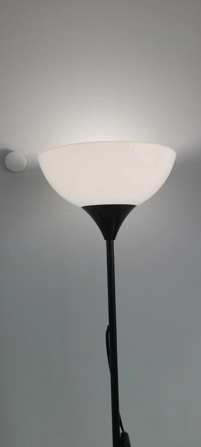 This black floor lamp features a frosted dome shade for soft, diffused lighting. The slim design makes it a great addition to any room needing extra light. Simple on/off switch on the cord.