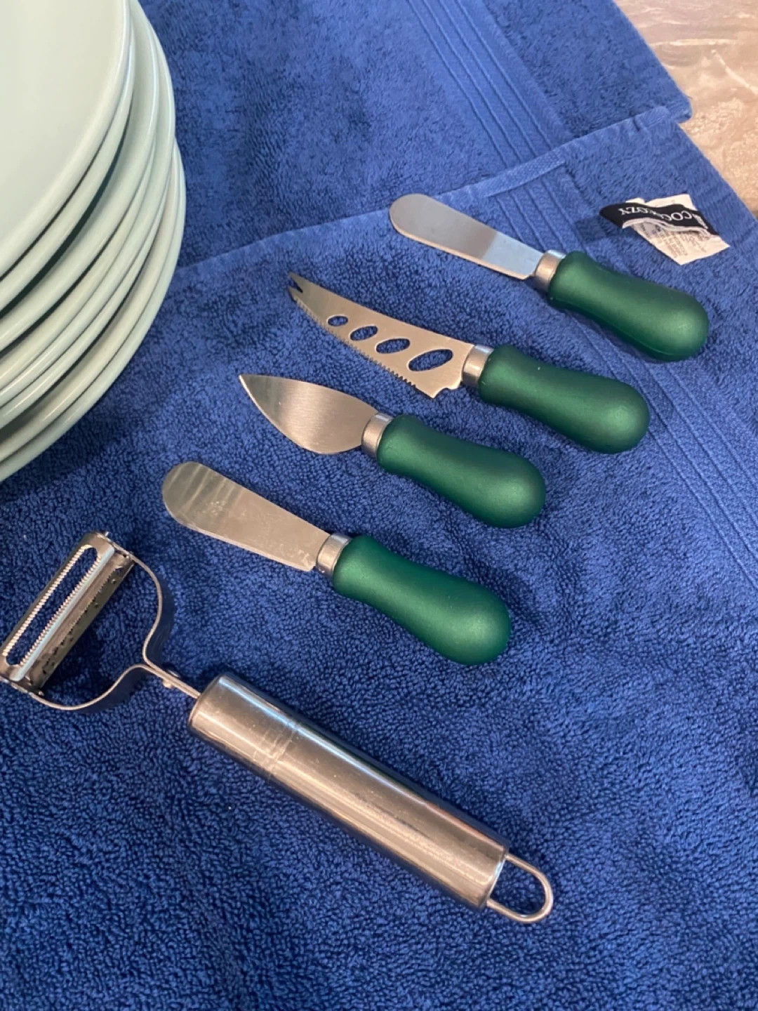 Also cutlery set… 8 pc each except the small spoon and large fork, there’s 1 pc missing from each. Throwing in the cheese knife set and veggie peeler. * Drawer organizer tray NOT included.