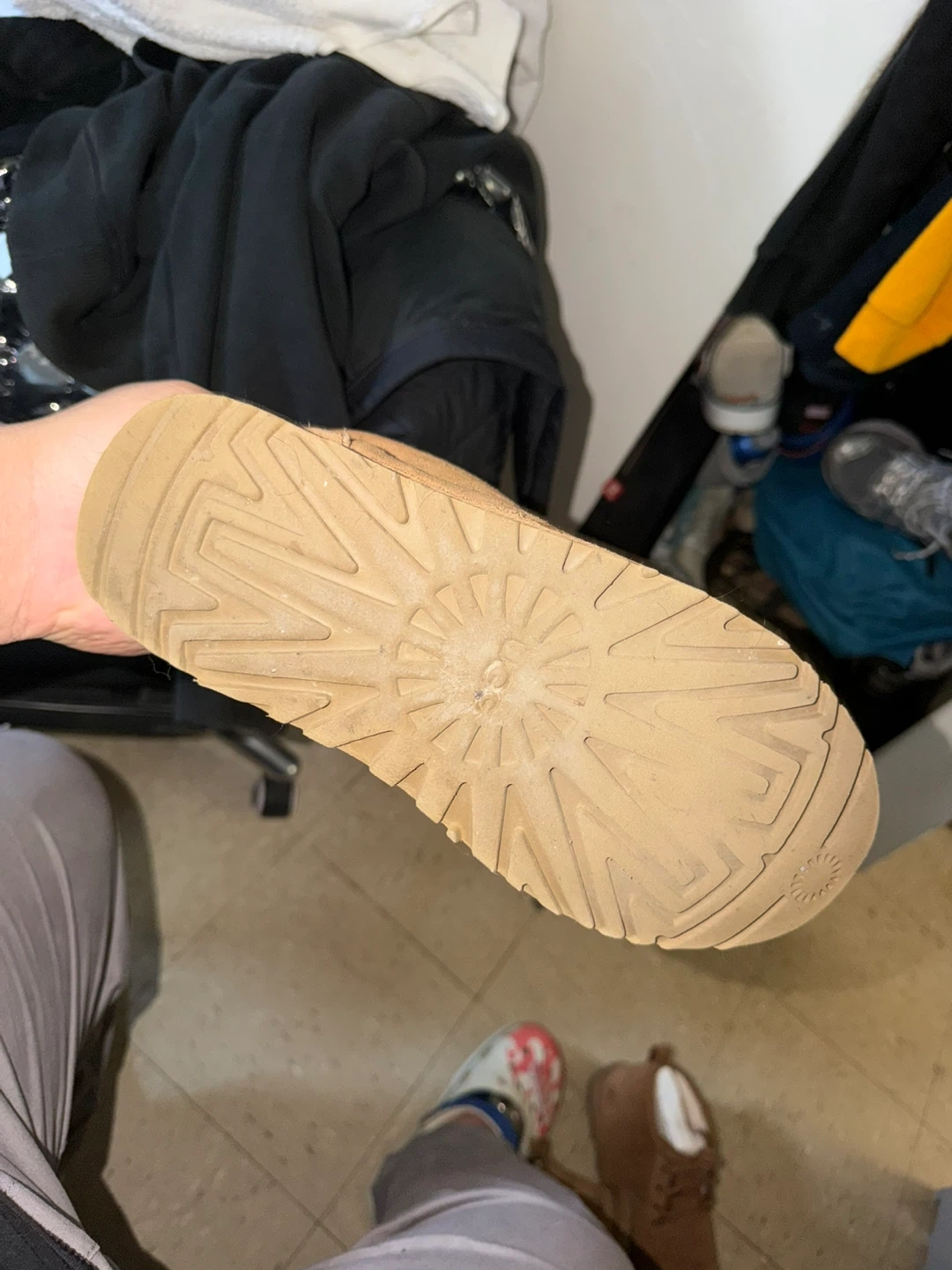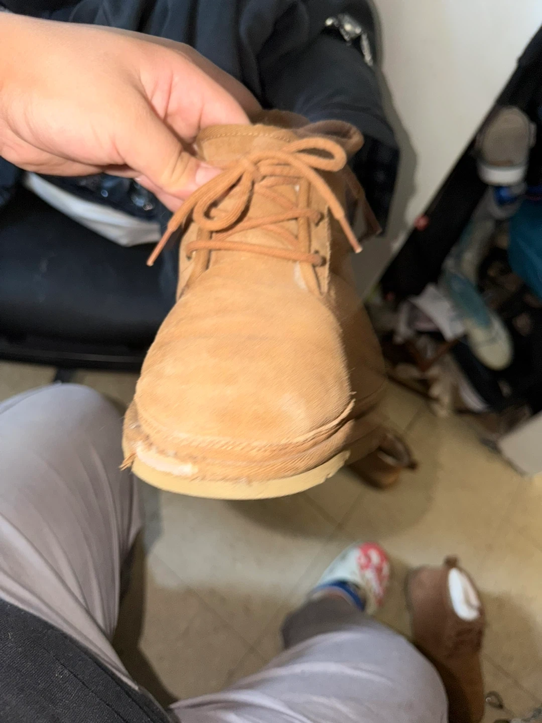Tan suede UGG chukka boots. These boots show some wear and tear, particularly on the toe and sole edges. They feature lace-up closure and the classic UGG logo on the heel counter. Perfect for casual wear in cooler weather.