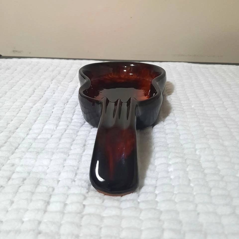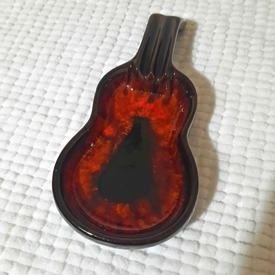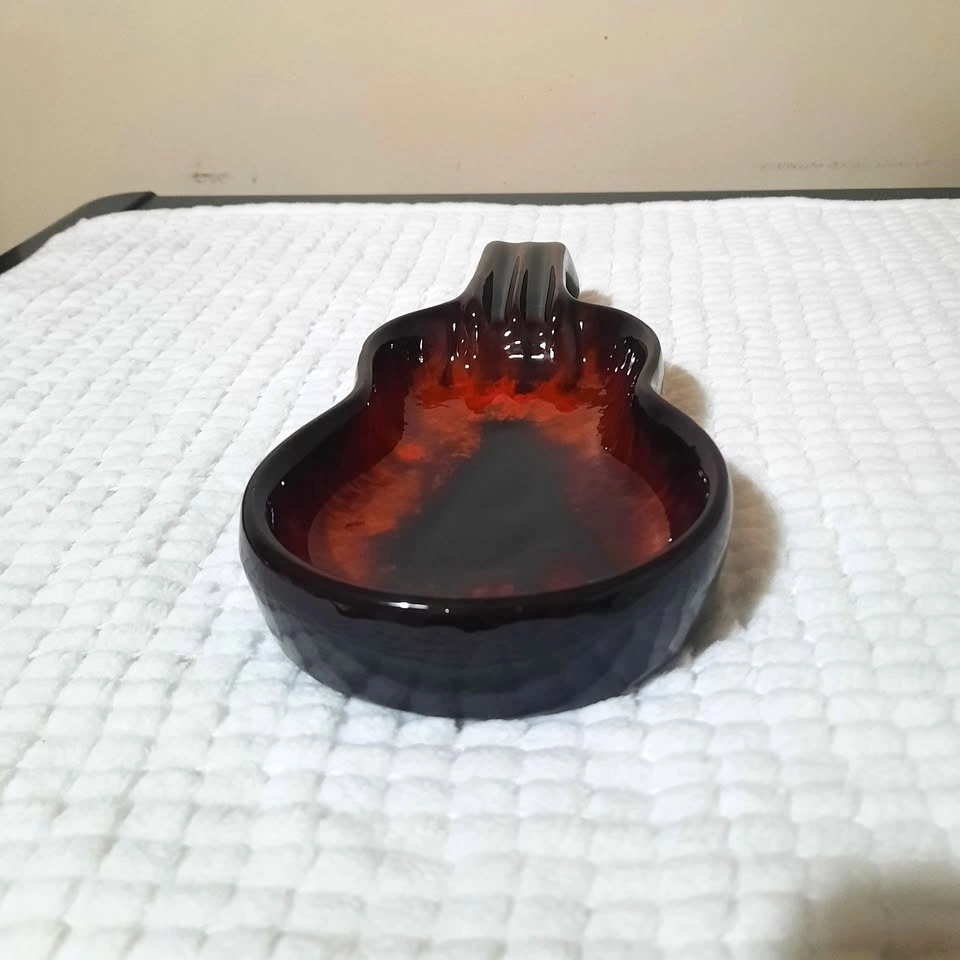 Beautiful vintage Evangeline ceramic violin/guitar shaped ashtray with red/black glaze - made in Canada.