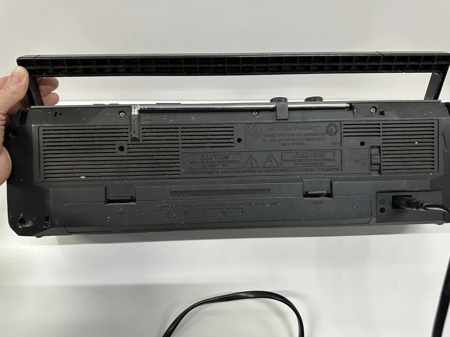 GE Boombox, Model: 3-5630GYB. AM/FM radio, cassette tape player. Silver color. Tested and working.