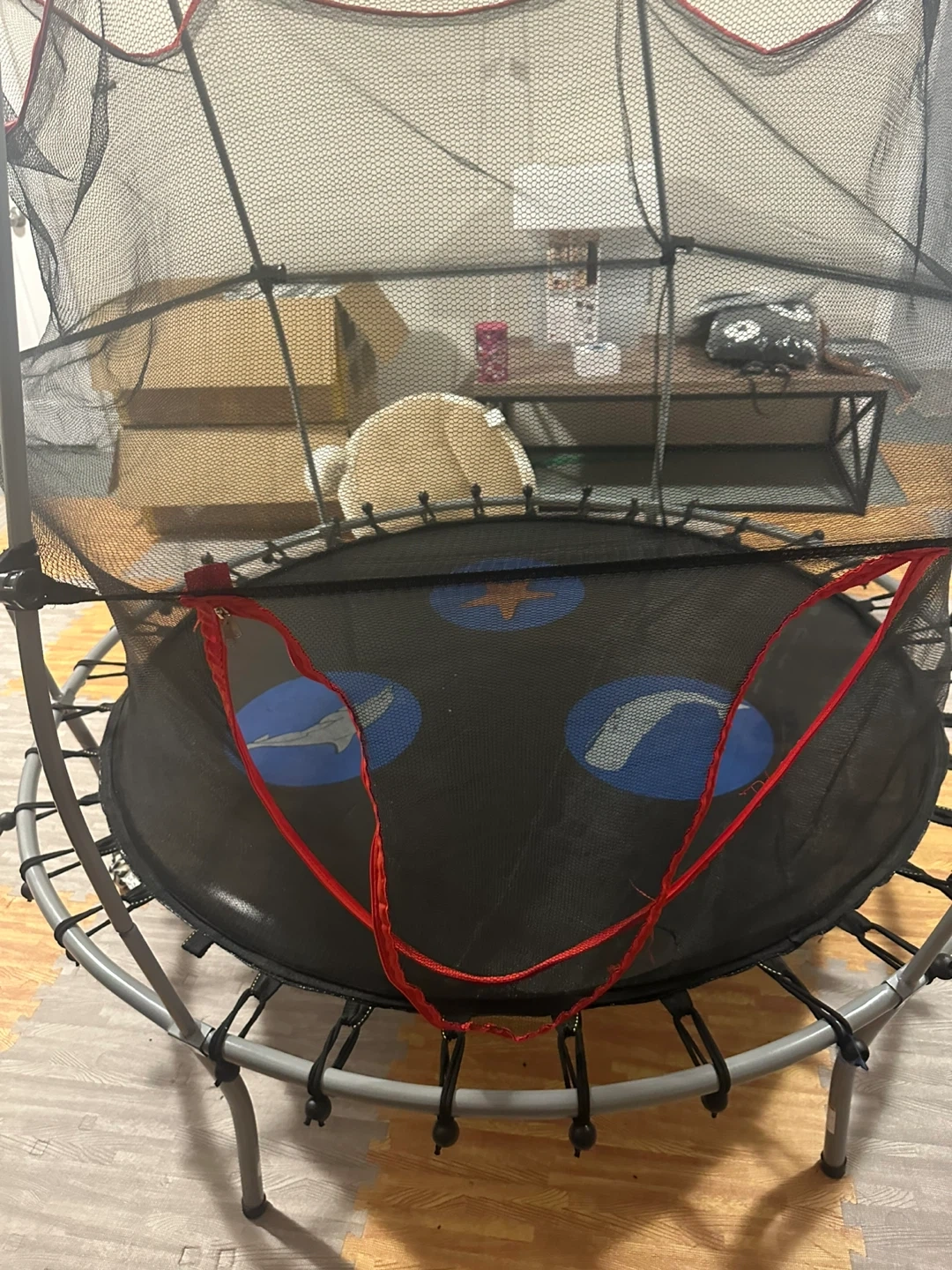 This trampoline features a fun net enclosure with colourful sea creature designs on the mat. It's perfect for indoor play. The net has some red ties for securing it.