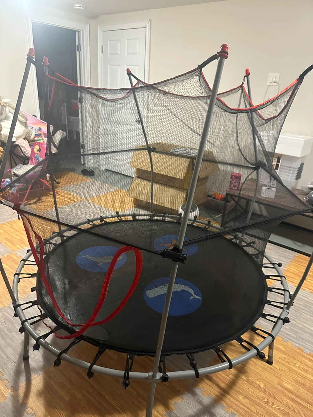 This trampoline features a fun net enclosure with colourful sea creature designs on the mat. It's perfect for indoor play. The net has some red ties for securing it.