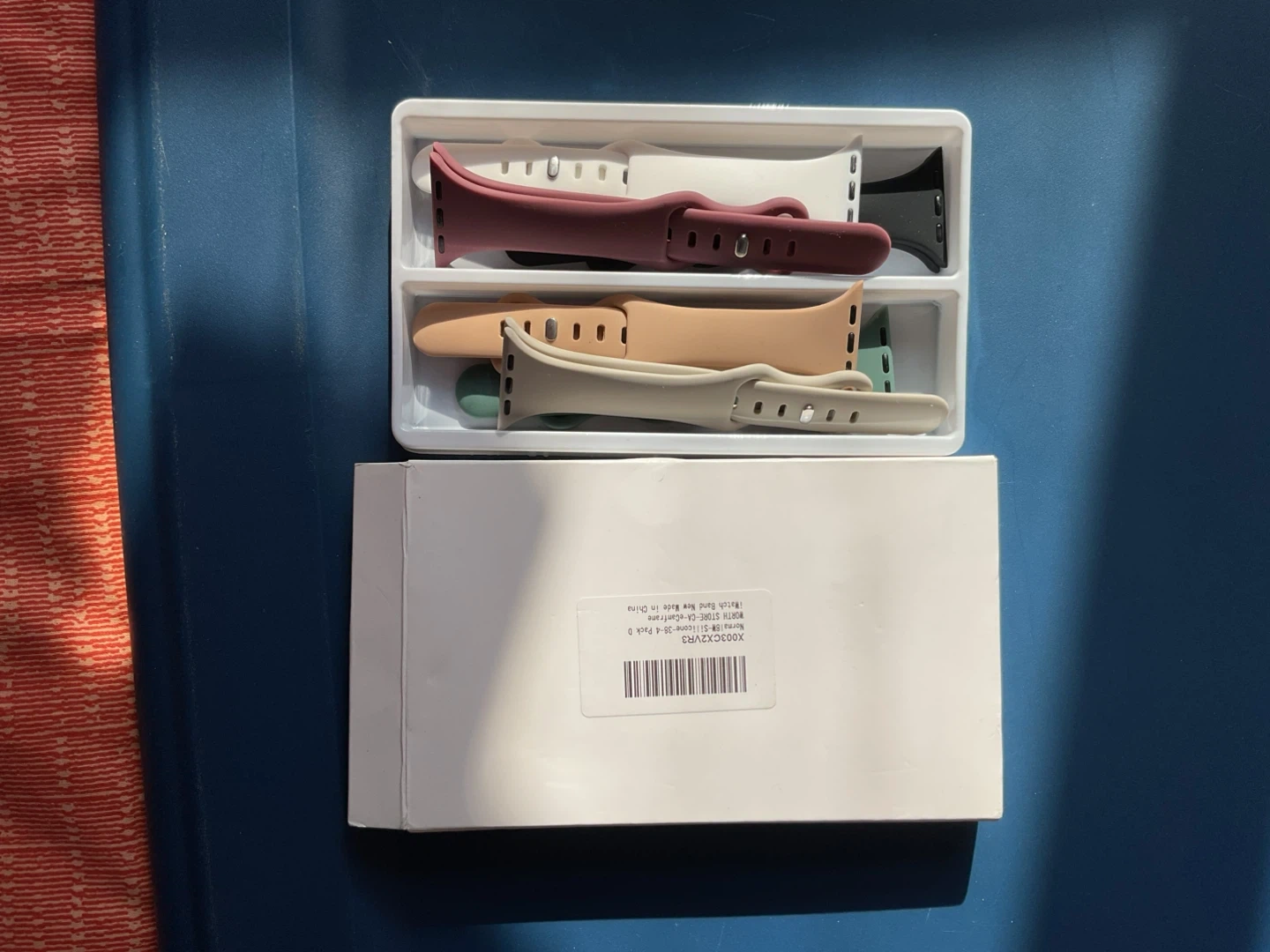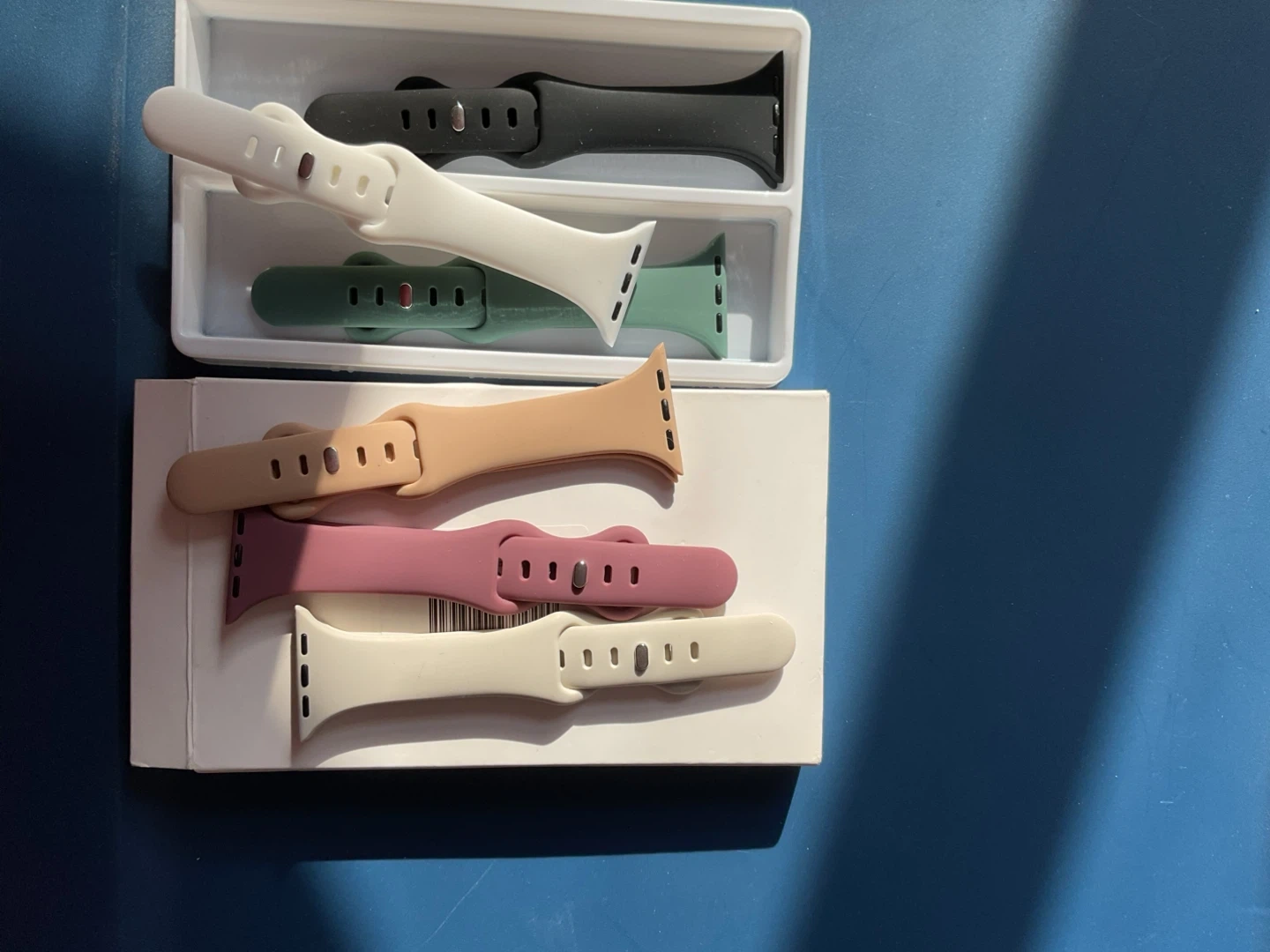 silicone watch bands. They're compatible with 38mm and 40mm watch sizes. Includes bands in black, white, rose gold, peach, dark pink, forest green, navy blue, and grey.