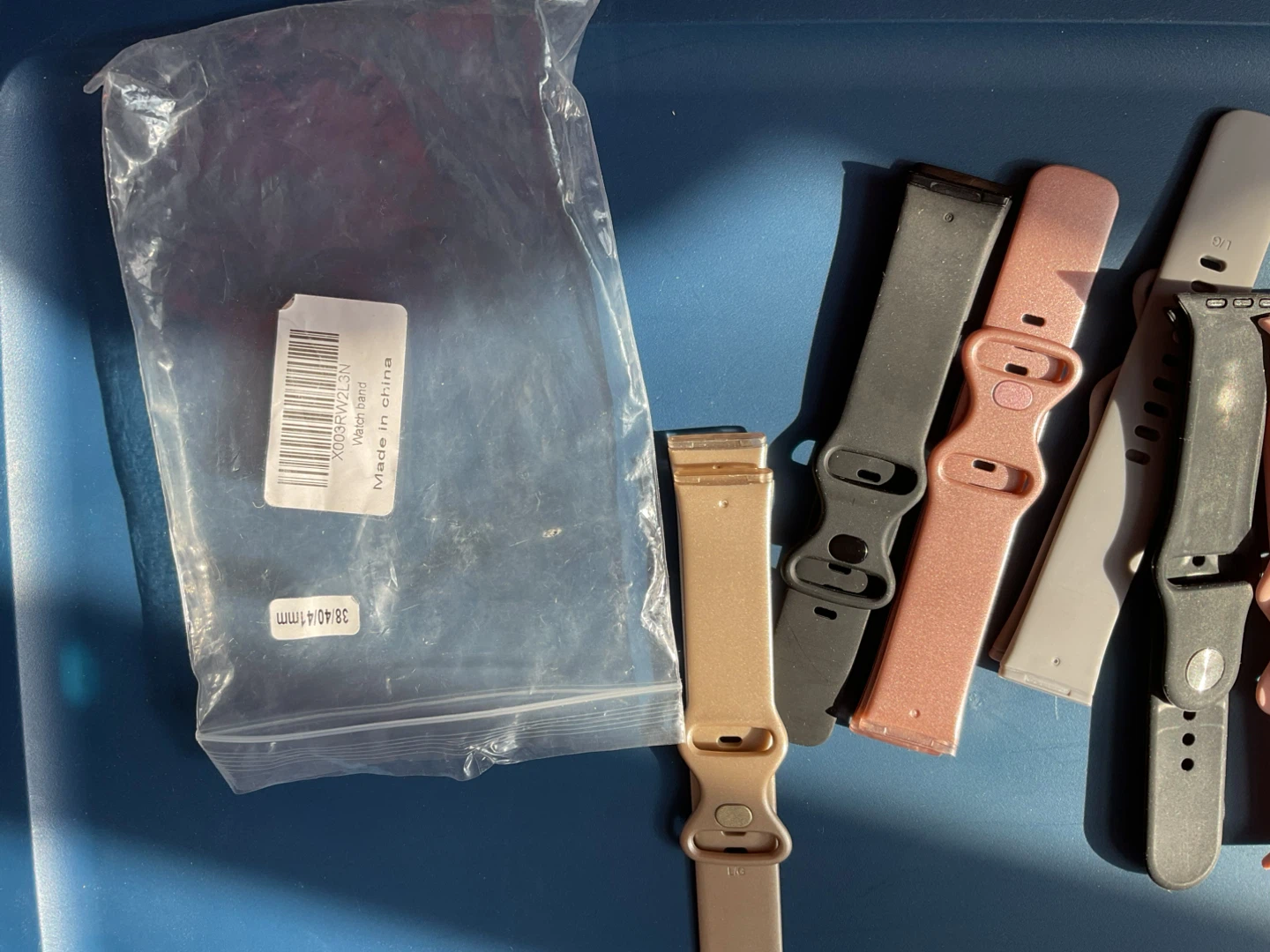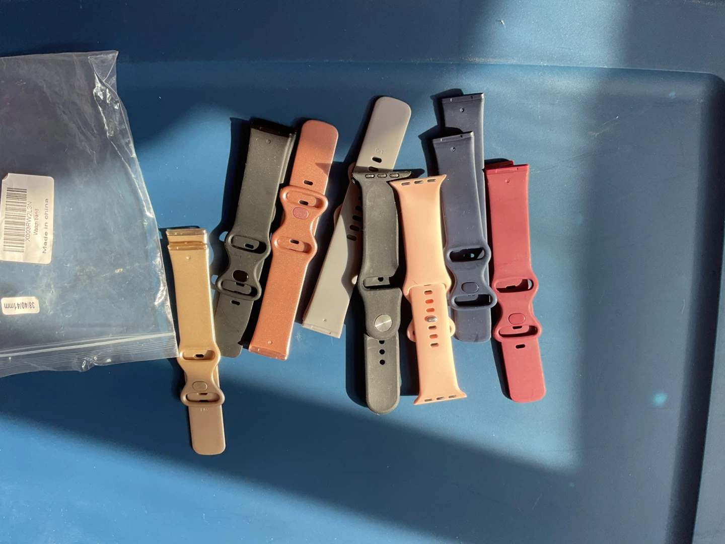 silicone watch bands. They're compatible with 38mm and 40mm watch sizes. Includes bands in black, white, rose gold, peach, dark pink, forest green, navy blue, and grey.