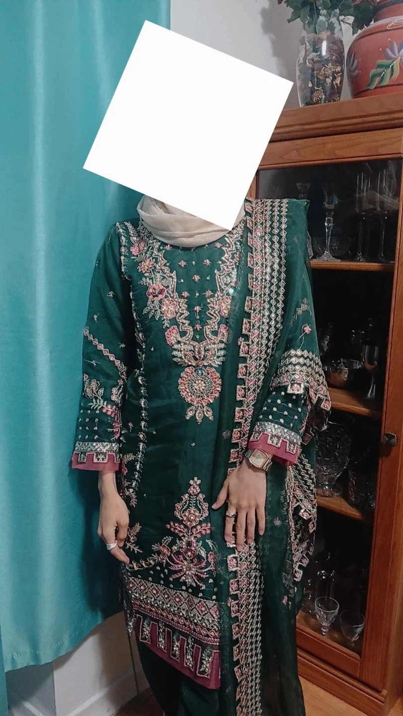 Gorgeous green embroidered 3-piece suit set. It's adorned with intricate pink and silver thread work all over. Perfect for formal occasions or festive celebrations!
