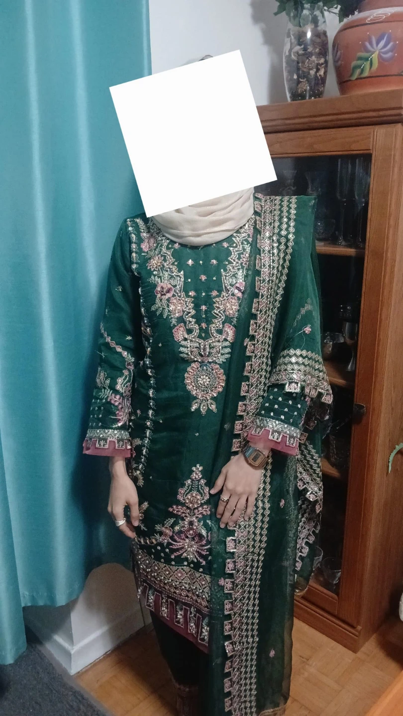 Gorgeous green embroidered 3-piece suit set. It's adorned with intricate pink and silver thread work all over. Perfect for formal occasions or festive celebrations!