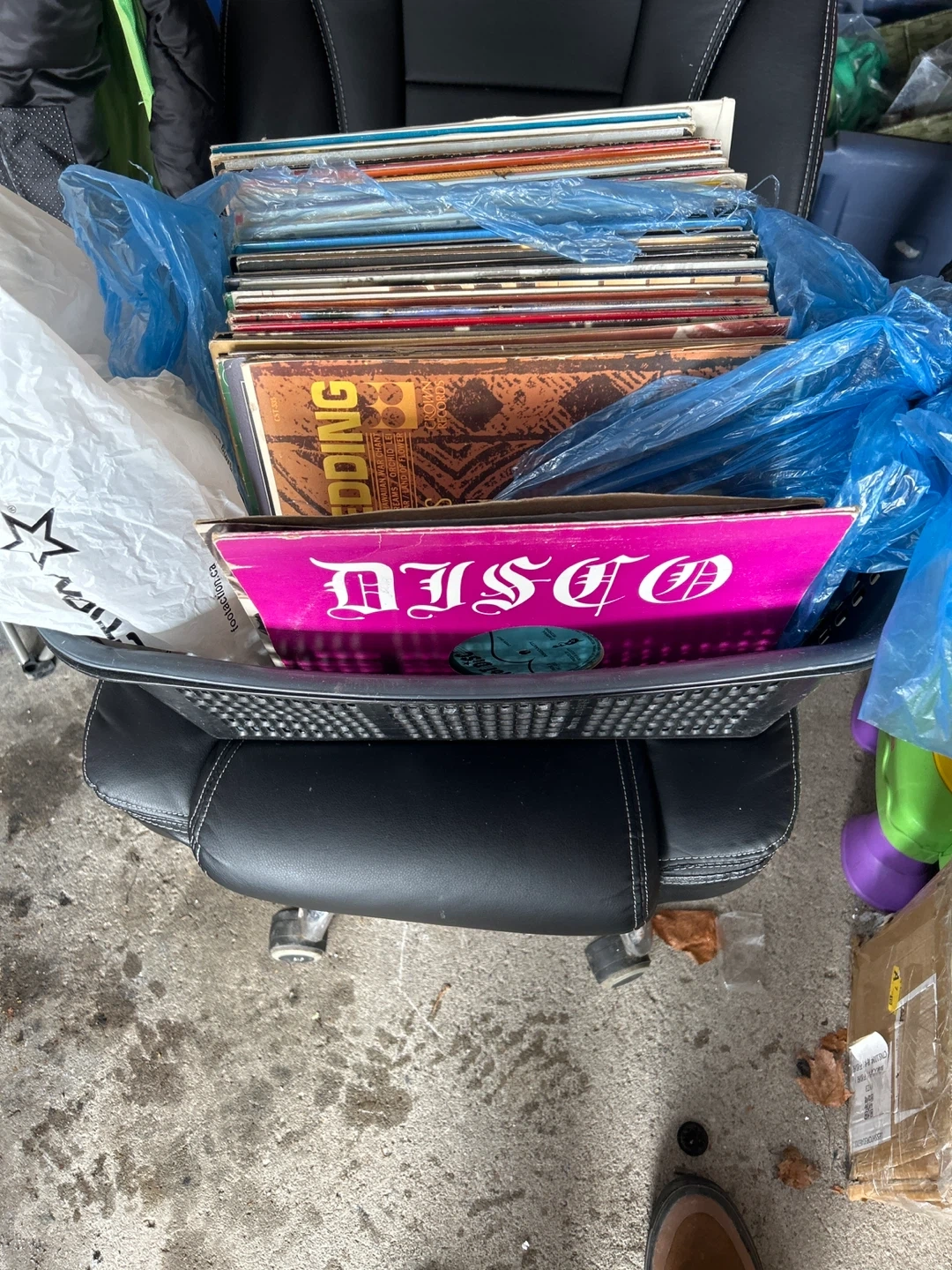 A stack of vinyl records, featuring disco and other genres. Includes titles like 'Disco', 'Hawaiian War Chant', and 'Edding'. Perfect for any vinyl enthusiast looking to expand their collection! 50 for all or come see what I have and give me a offer