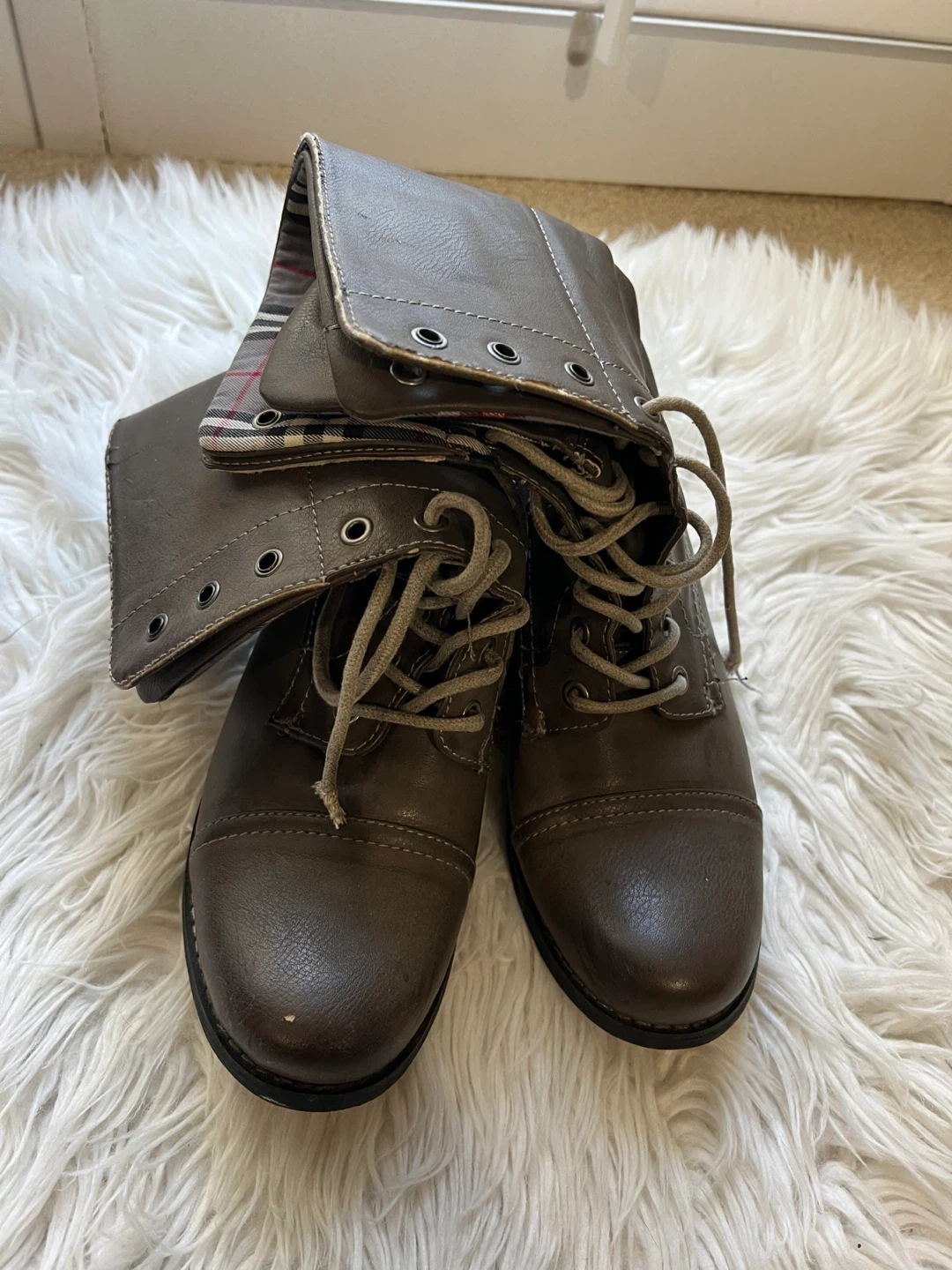 These women's boots feature a stylish fold-over cuff with plaid lining and functional laces for a secure fit. They include a side zipper for easy on and off. A great choice for casual wear this fall!