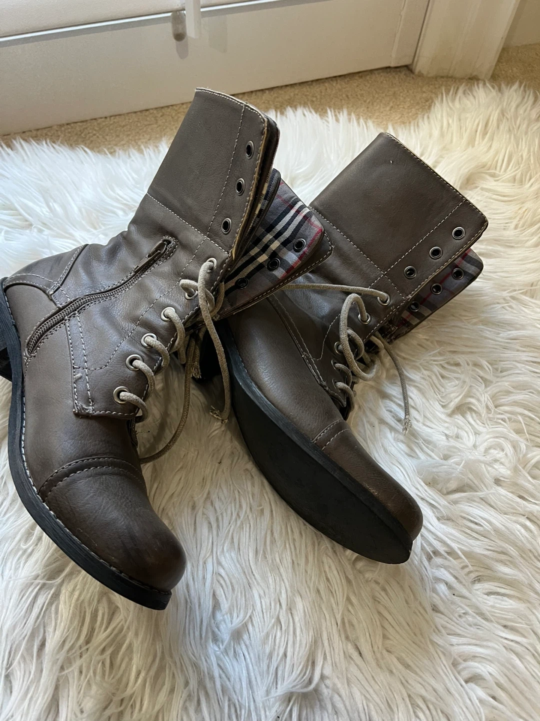 These women's boots feature a stylish fold-over cuff with plaid lining and functional laces for a secure fit. They include a side zipper for easy on and off. A great choice for casual wear this fall!