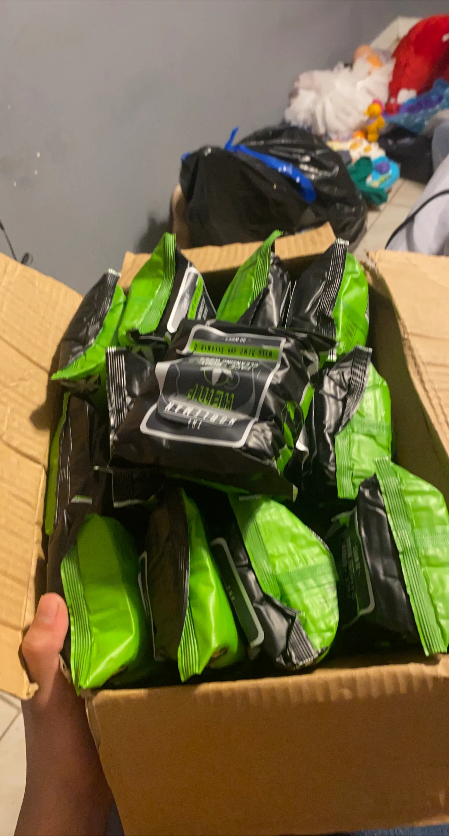 These facial cleansing wipes are from The Nobleman brand. Each pack contains cleansing towelettes with hemp and vitamin C. Individual packs are green and black.