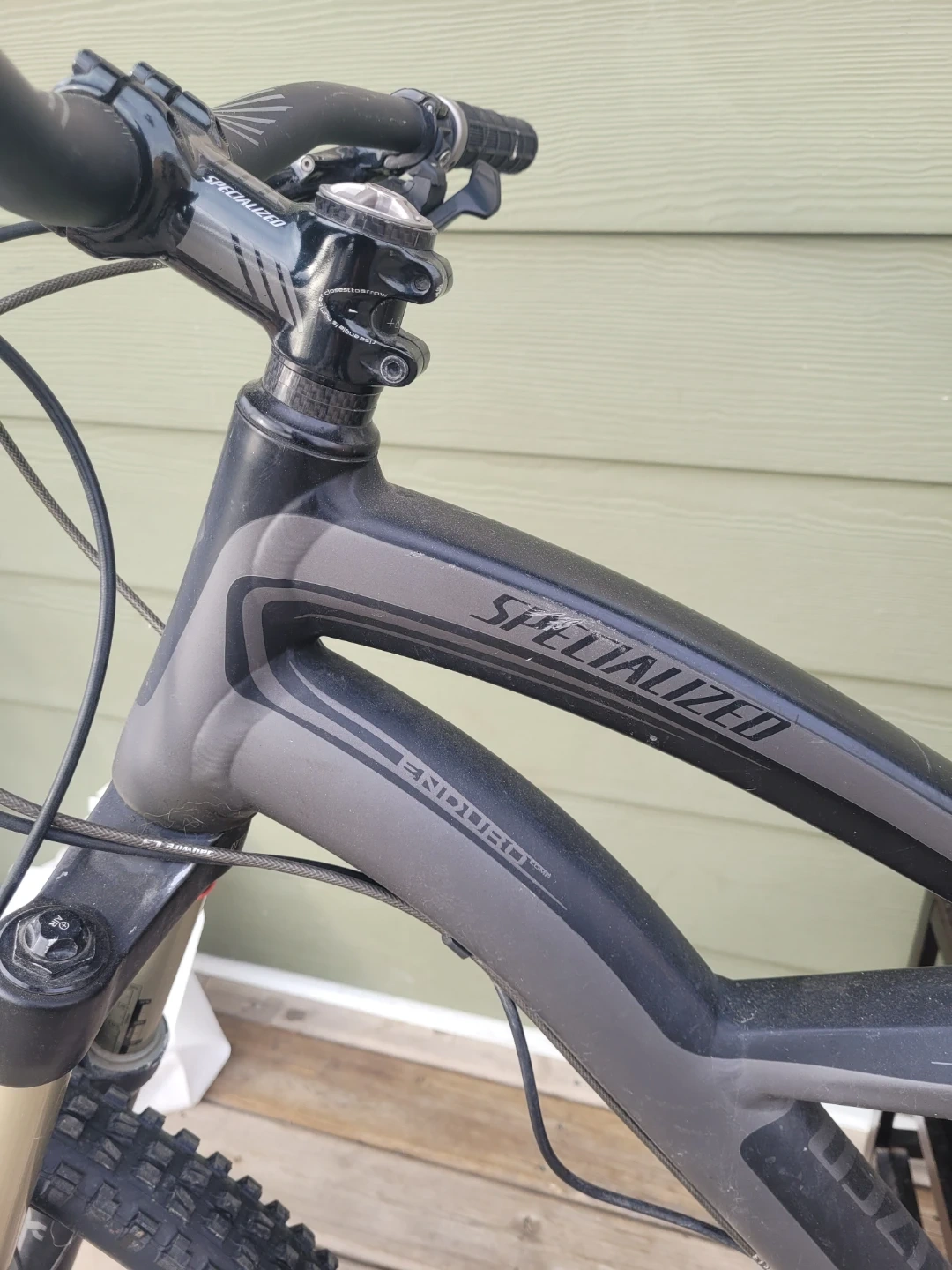 Used Specialized Enduro full-suspension mountain bike. It's a reliable ride with disc brakes and Maxxis tires. This bike is great for tackling trails and downhill riding.