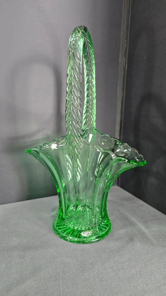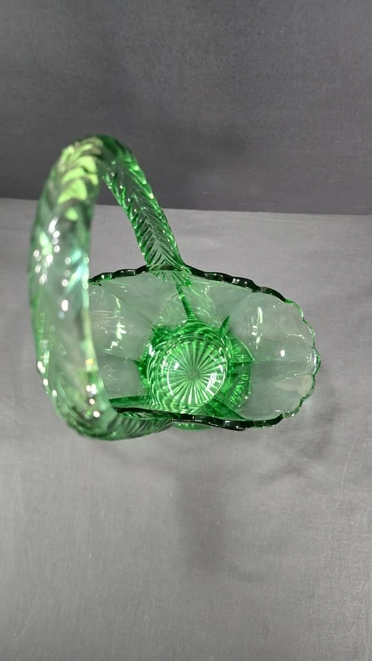 An elegant emerald-green pressed glass basket with a graceful handle and vintage-inspired floral form, a striking collectible or statement décor piece.
