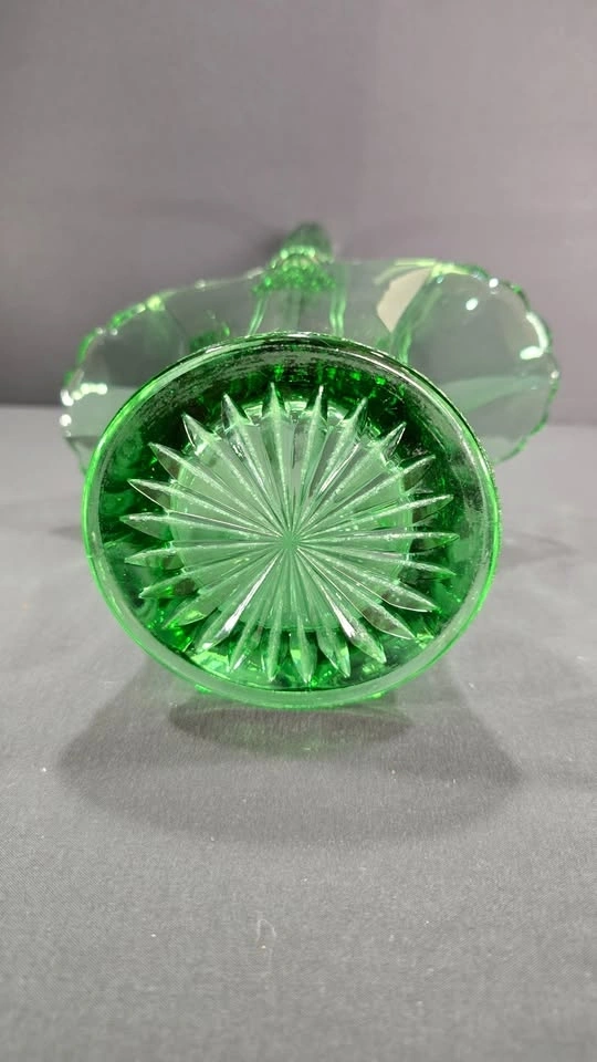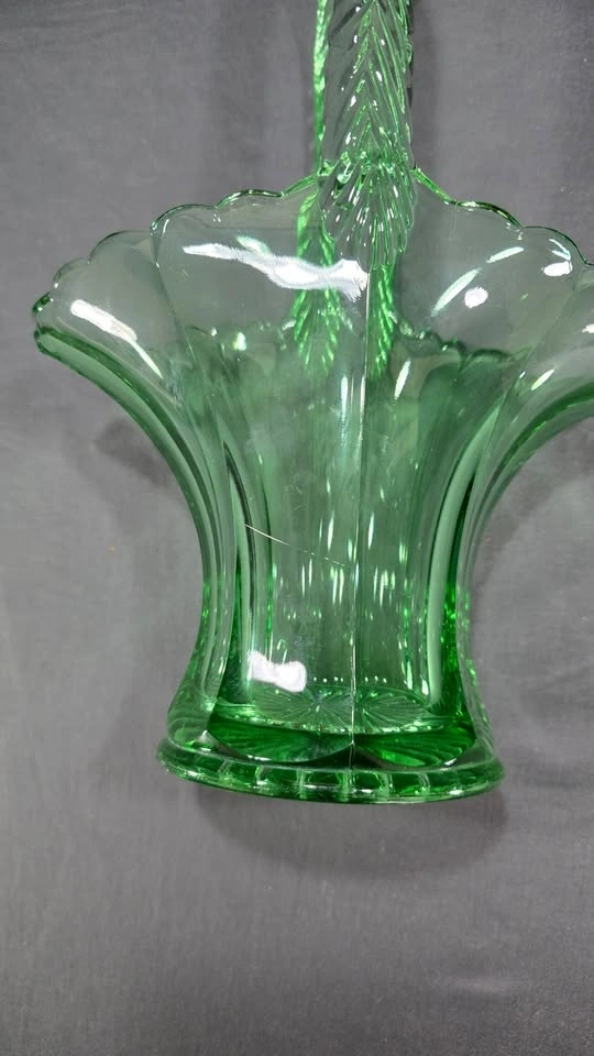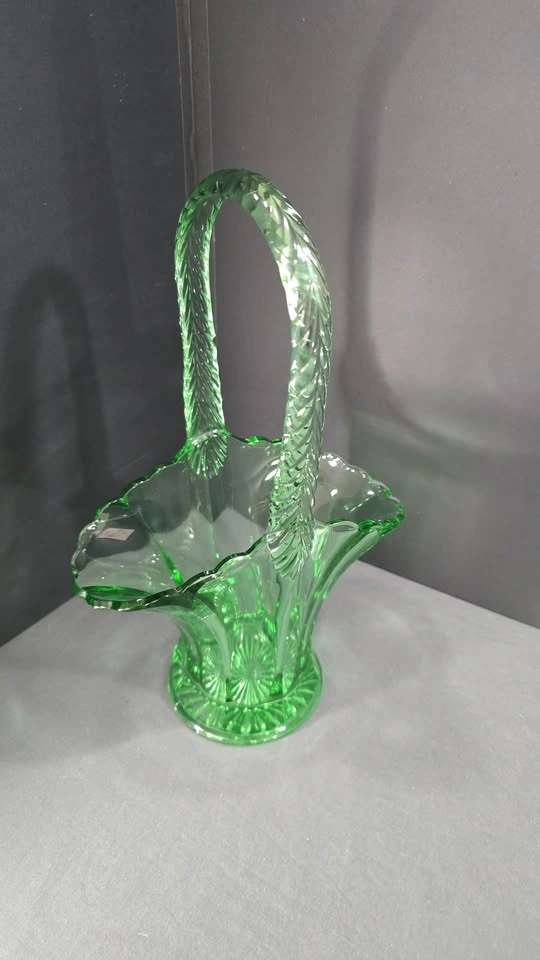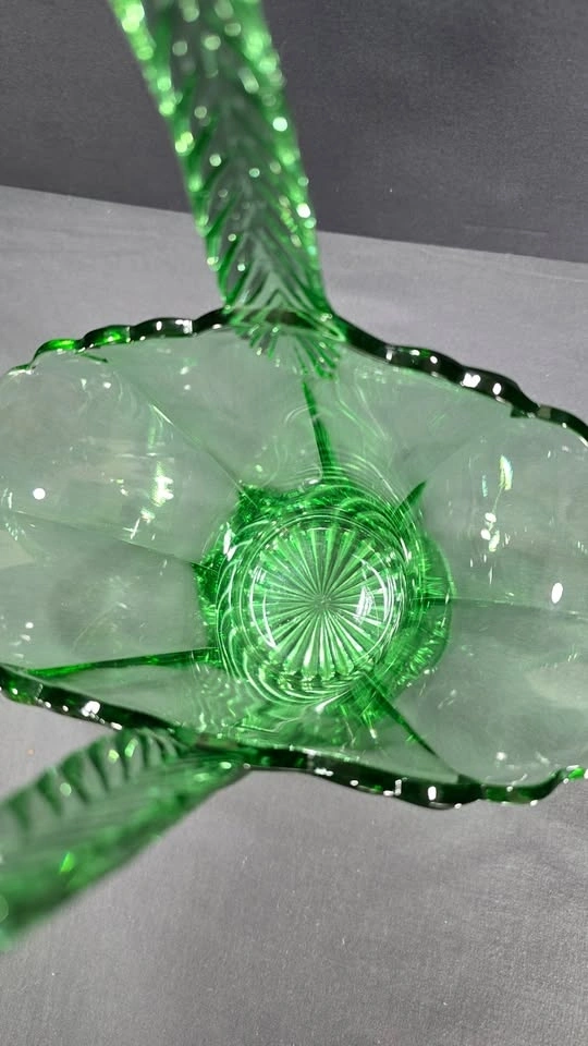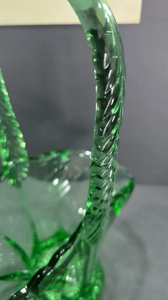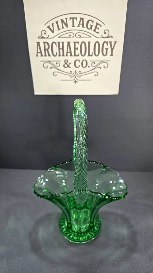 An elegant emerald-green pressed glass basket with a graceful handle and vintage-inspired floral form, a striking collectible or statement décor piece.