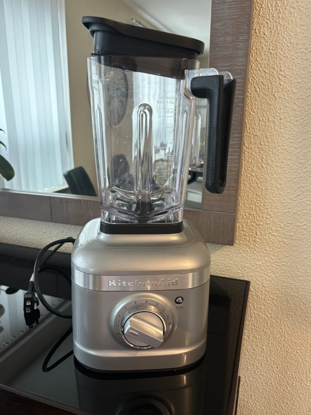This is a silver KitchenAid blender. It has multiple speed settings for various blending needs. The pitcher is made of durable, clear plastic with measurement markings.