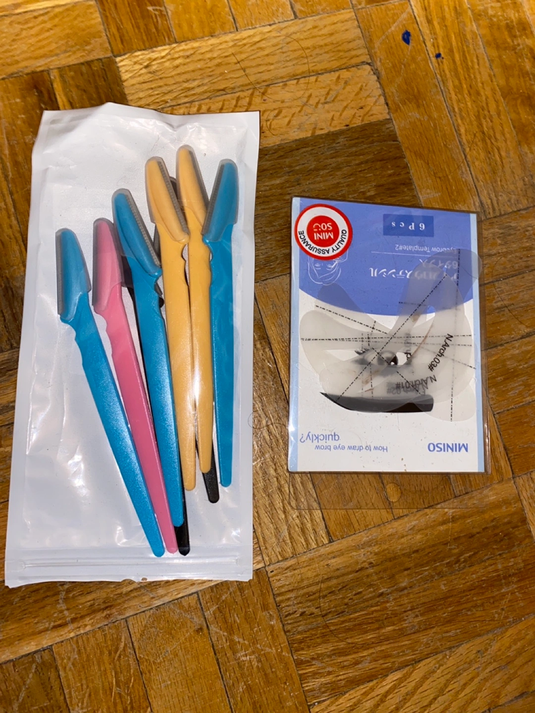 Eyebrow razors and stencil set. Includes 6 razors and a stencil with 6 eyebrow shapes.