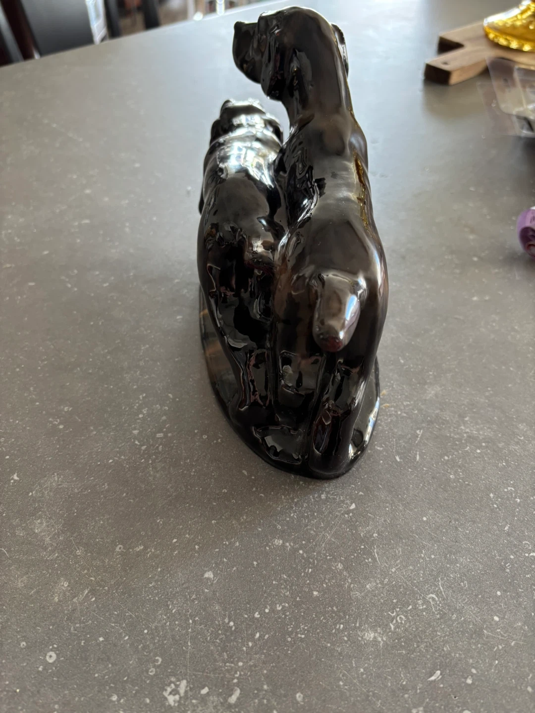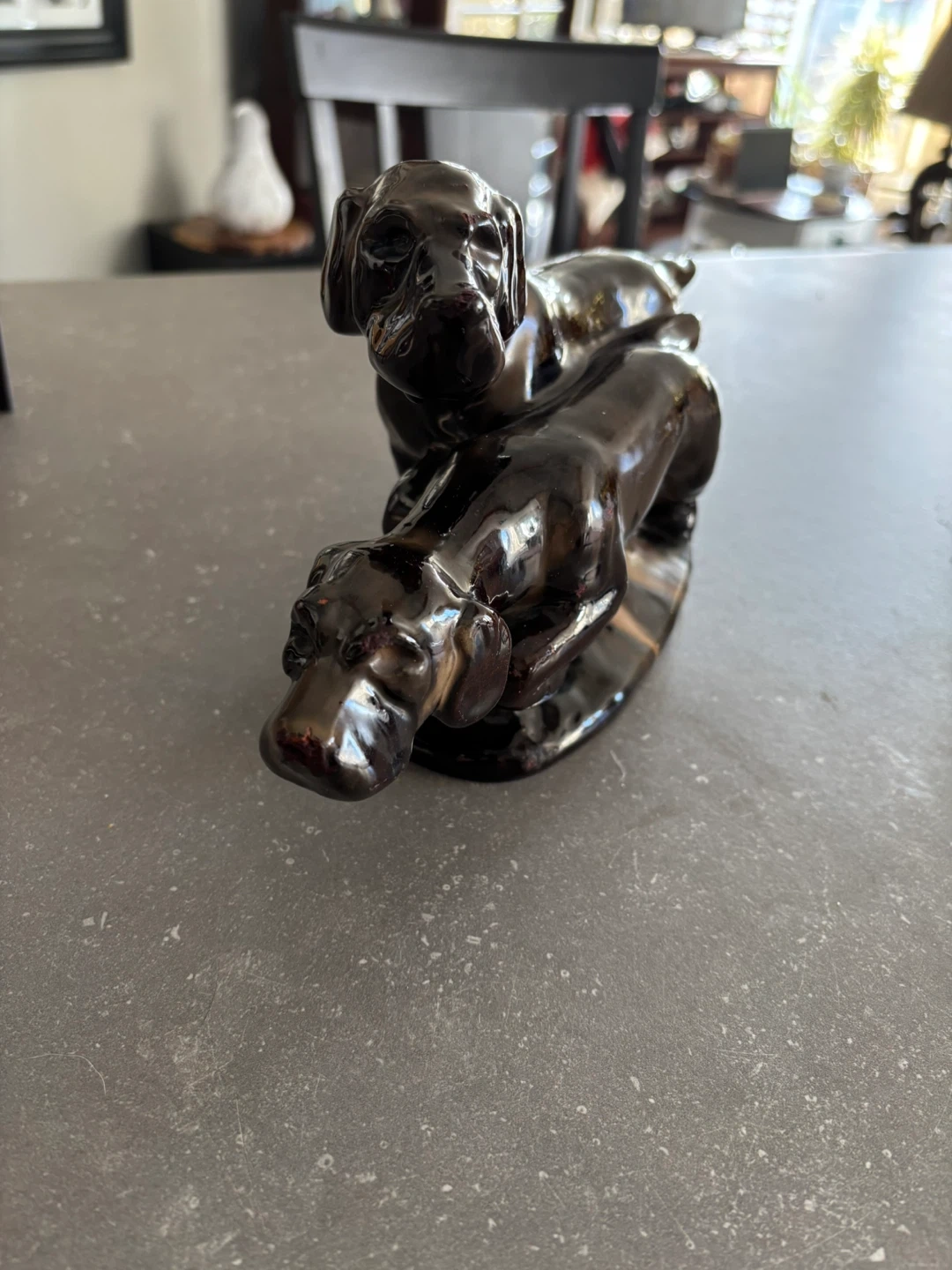 This is a heavy vintage Hungarian ceramic figural representation of two hunting dogs in pursuit. It features a rich brown glazed body. The piece measures 11" long x 6.25" deep x 4" tall. A Komlós makers mark is on the bottom. Who would this be useful for? A collector of ceramic art or hunting enthusiasts!