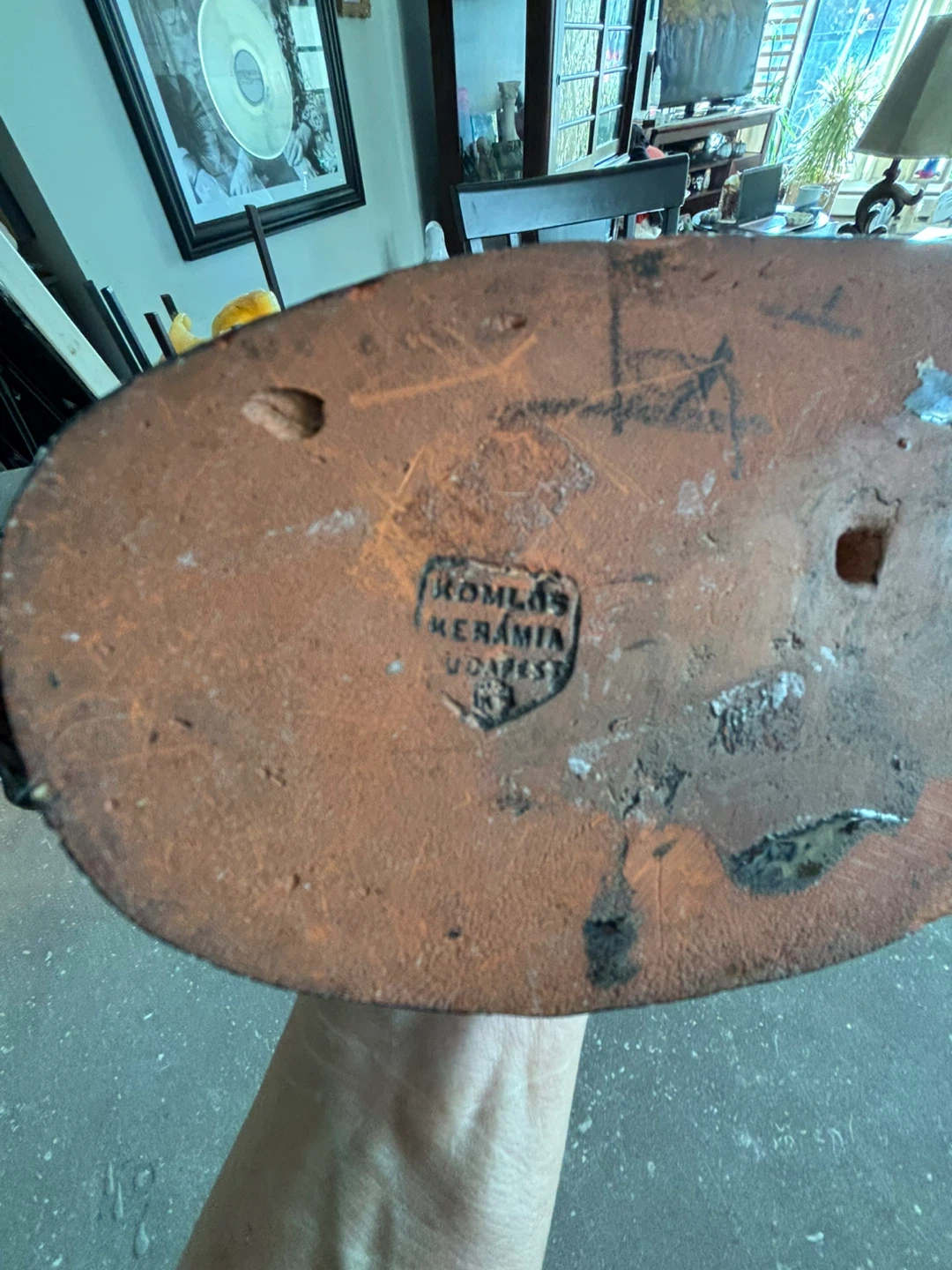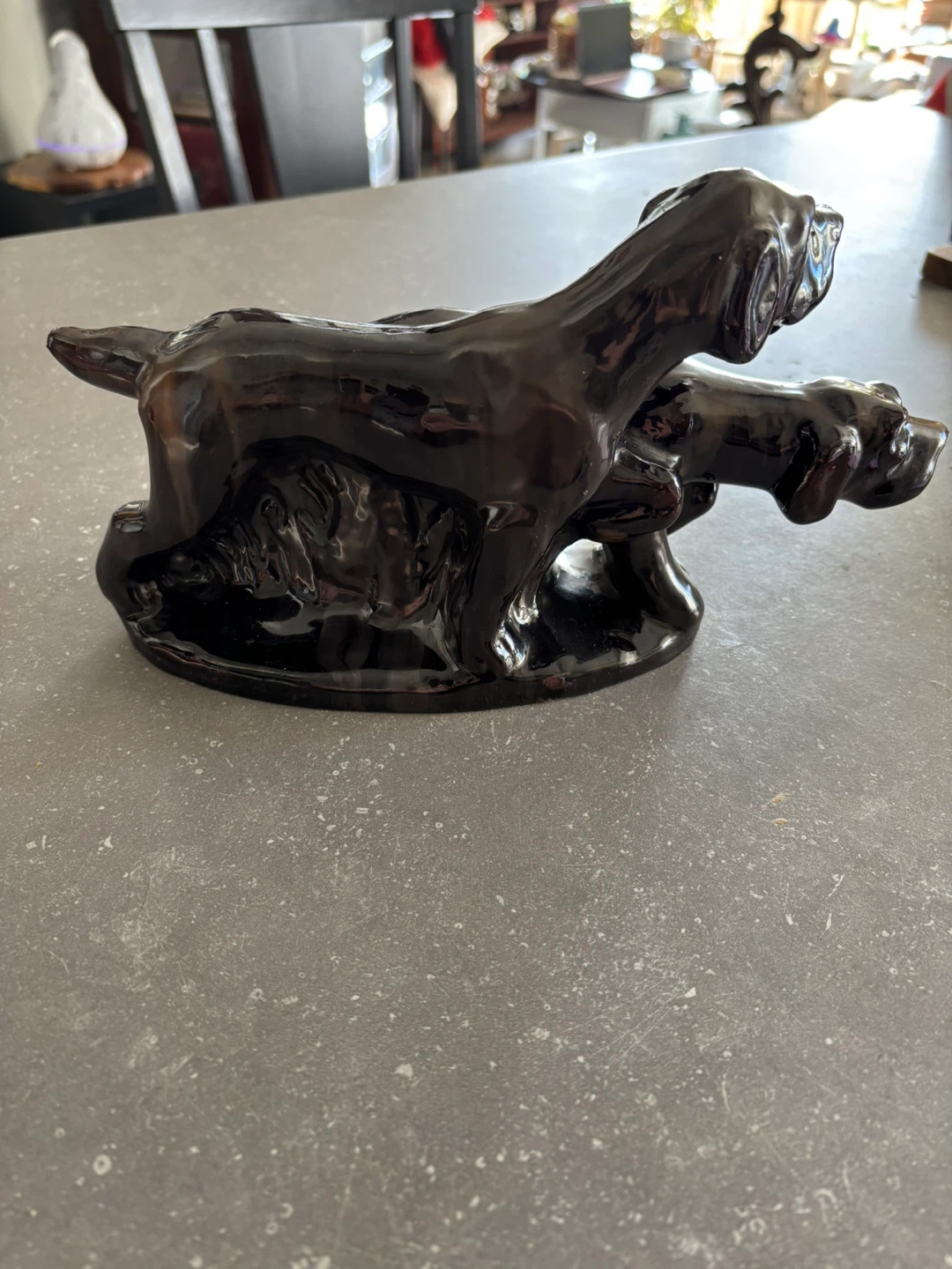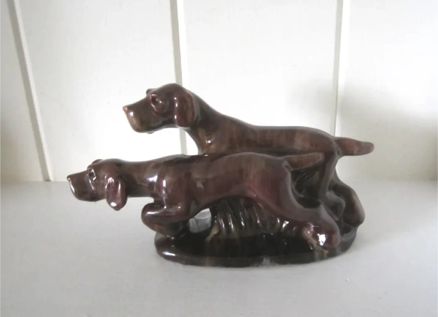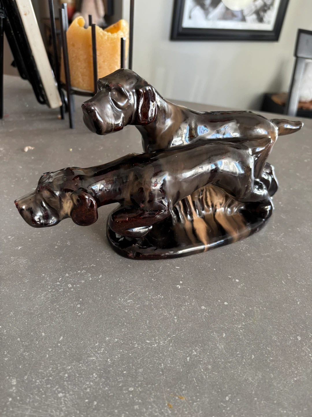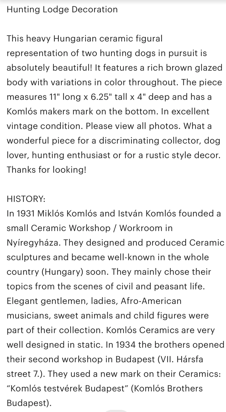 This is a heavy vintage Hungarian ceramic figural representation of two hunting dogs in pursuit. It features a rich brown glazed body. The piece measures 11" long x 6.25" deep x 4" tall. A Komlós makers mark is on the bottom. Who would this be useful for? A collector of ceramic art or hunting enthusiasts!