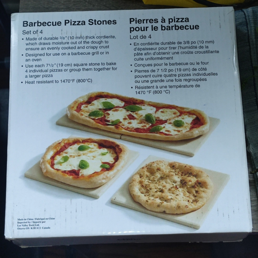 Brand New In Box, never used before. Set of 4 Barbecue Pizza Stones. Designed for use on a barbecue grill or in an oven. 7.5" or 19cm each square stone. 30 Sq Inch Pizza when combined! Made of durable 3/8" (10mm) thick cordierite, which draws moistuee out of the dough to ensure an evenly cooked and crispy crust. Heat resistant to 800° C or 1470° F. You can back 4 individual pizzas or one large pizza!