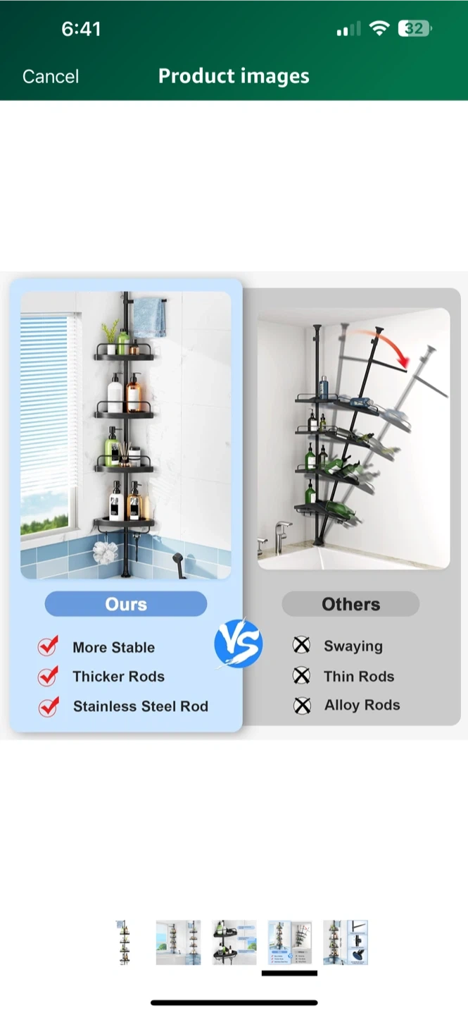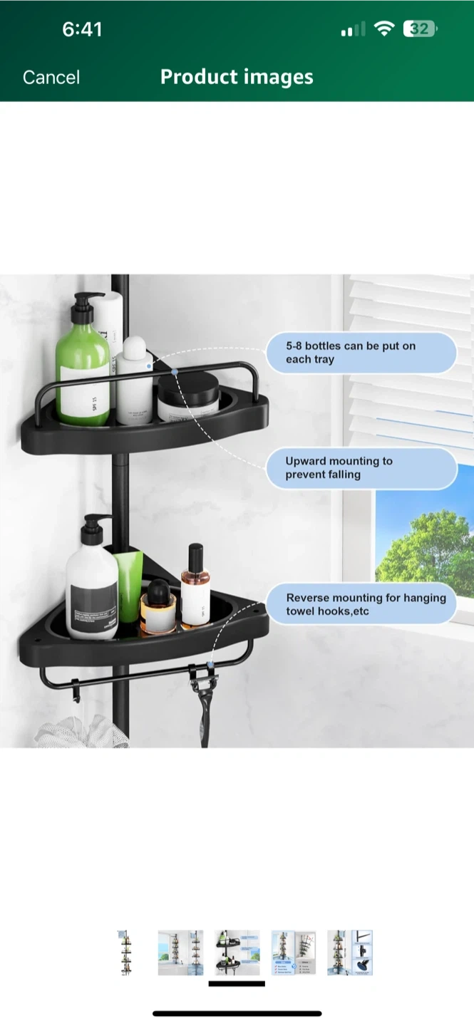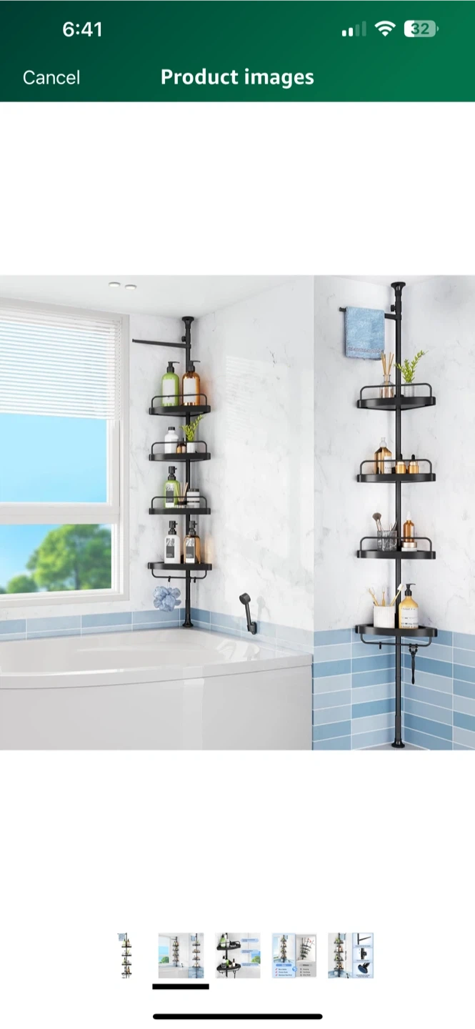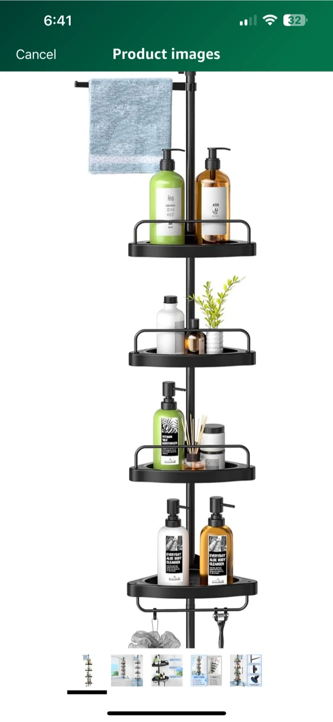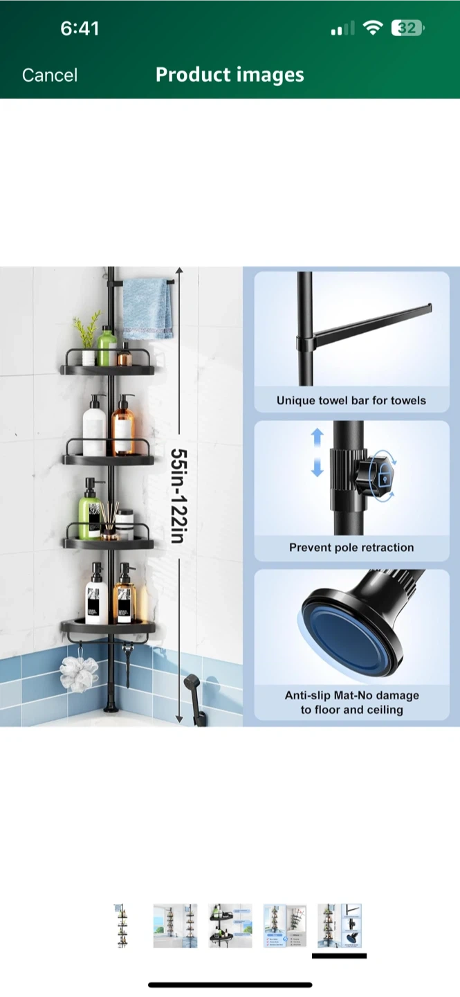 Declutter your shower with this handy telescopic corner shelf! It's black and designed to fit neatly into the corner of your shower or tub. The height is adjustable from 55cm to 122cm. It features a unique towel bar and an anti-slip mat to protect your floor and ceiling! Brand new in box