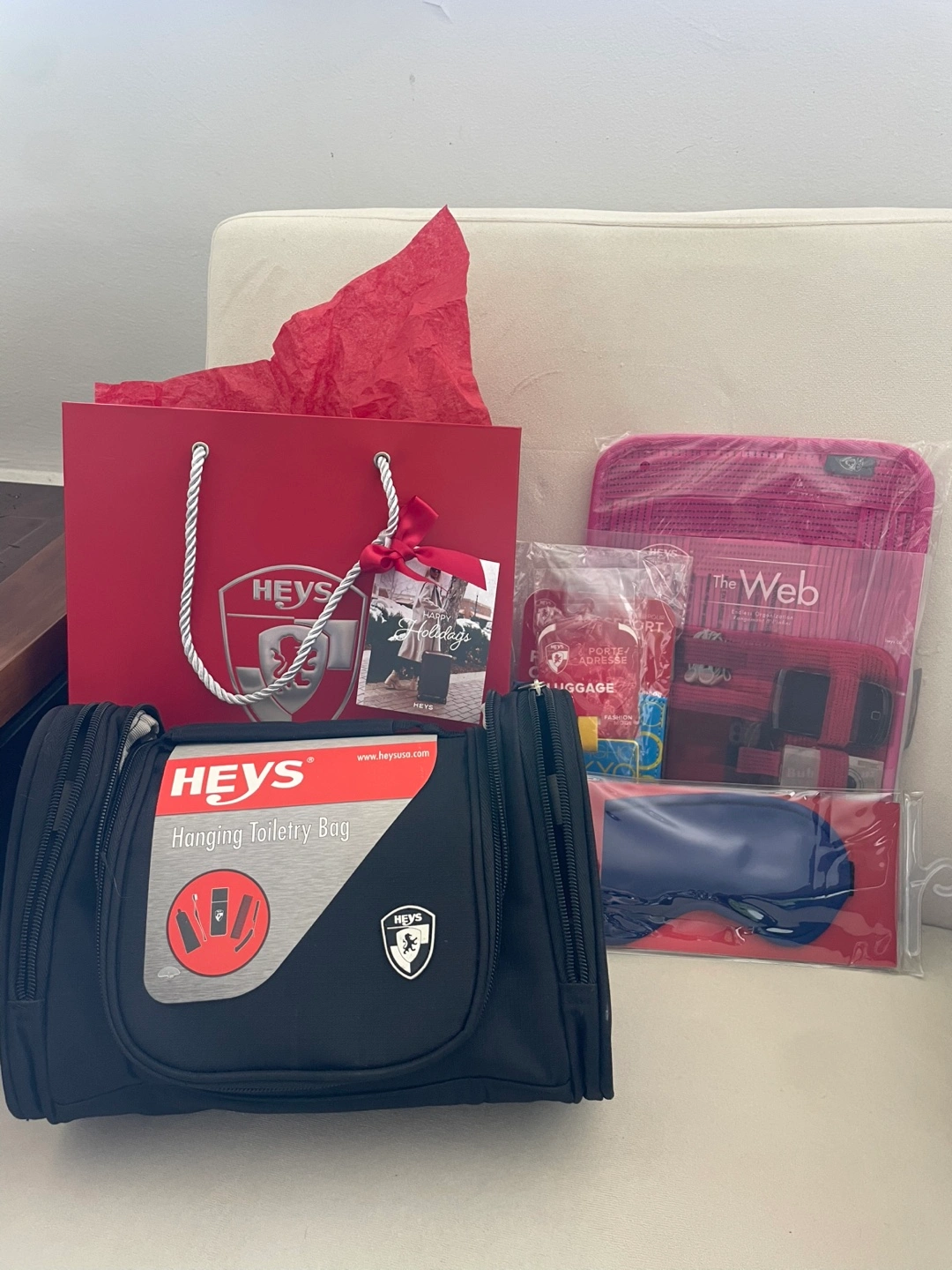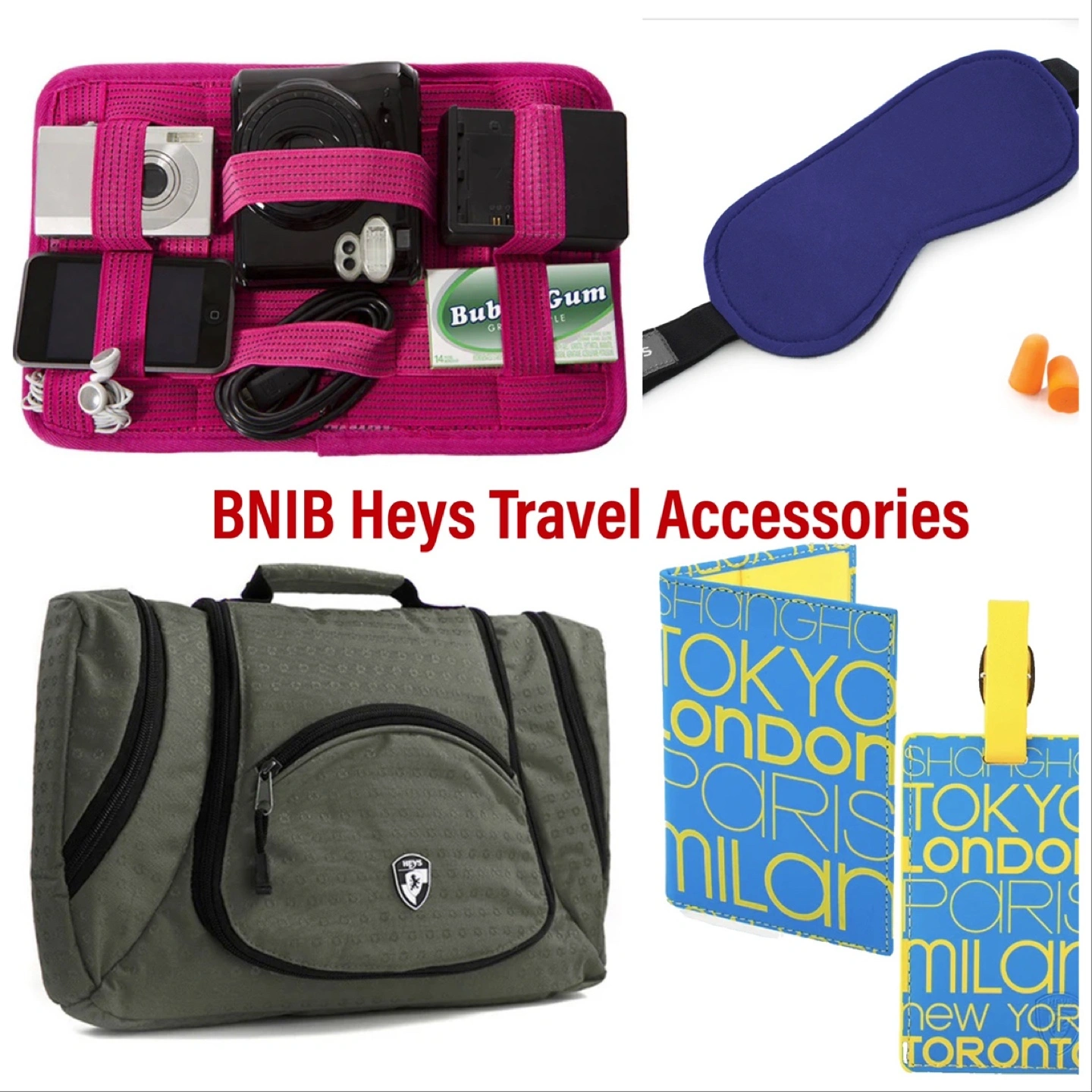 56All brand new in packaging, Heys Travel accessories. Great gift for a traveller! Over $150+ in value!! - Hanging toiletry kit - The Web Ultimate Organizer. Great for cords, electronics, travel adapters - Passport holder - Luggage tag - Luxury eye mask and ear plugs
