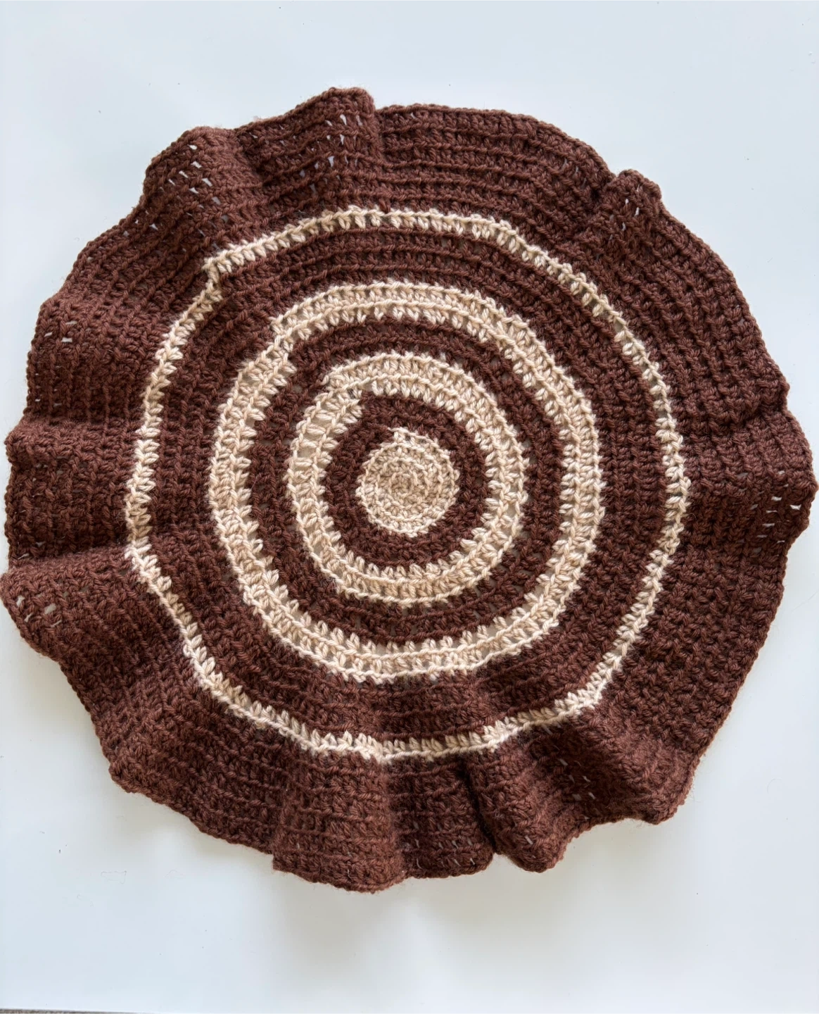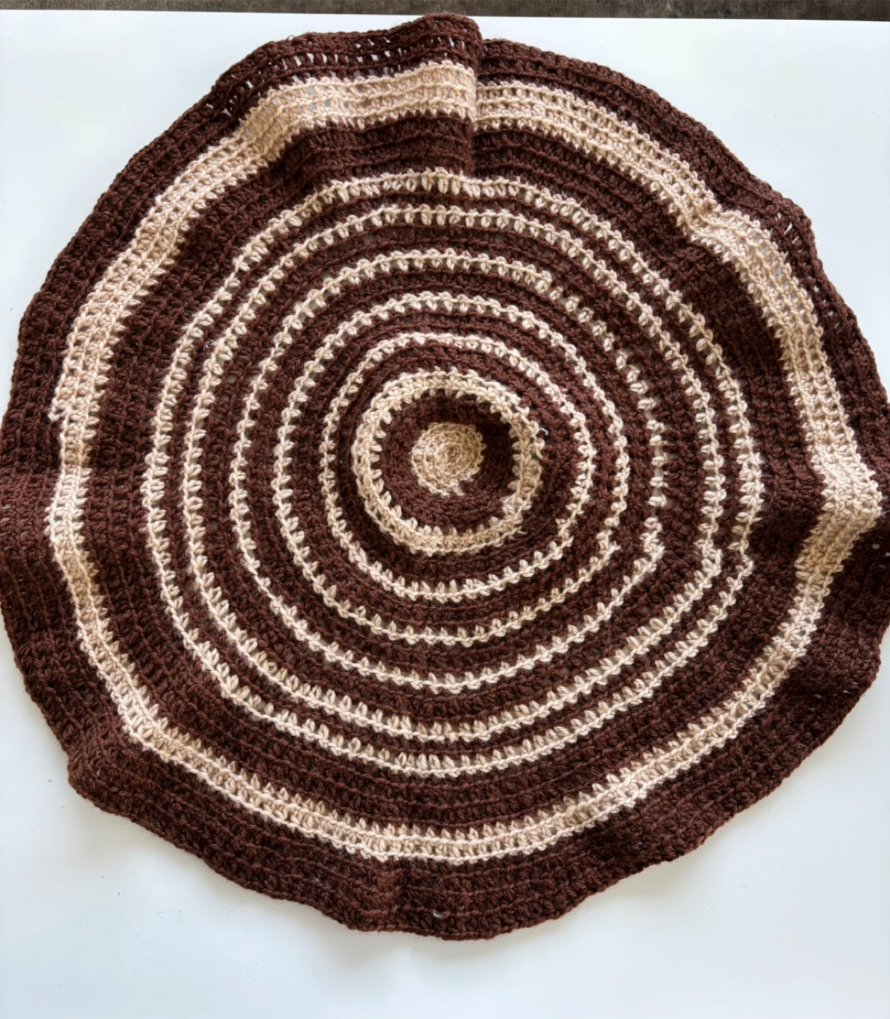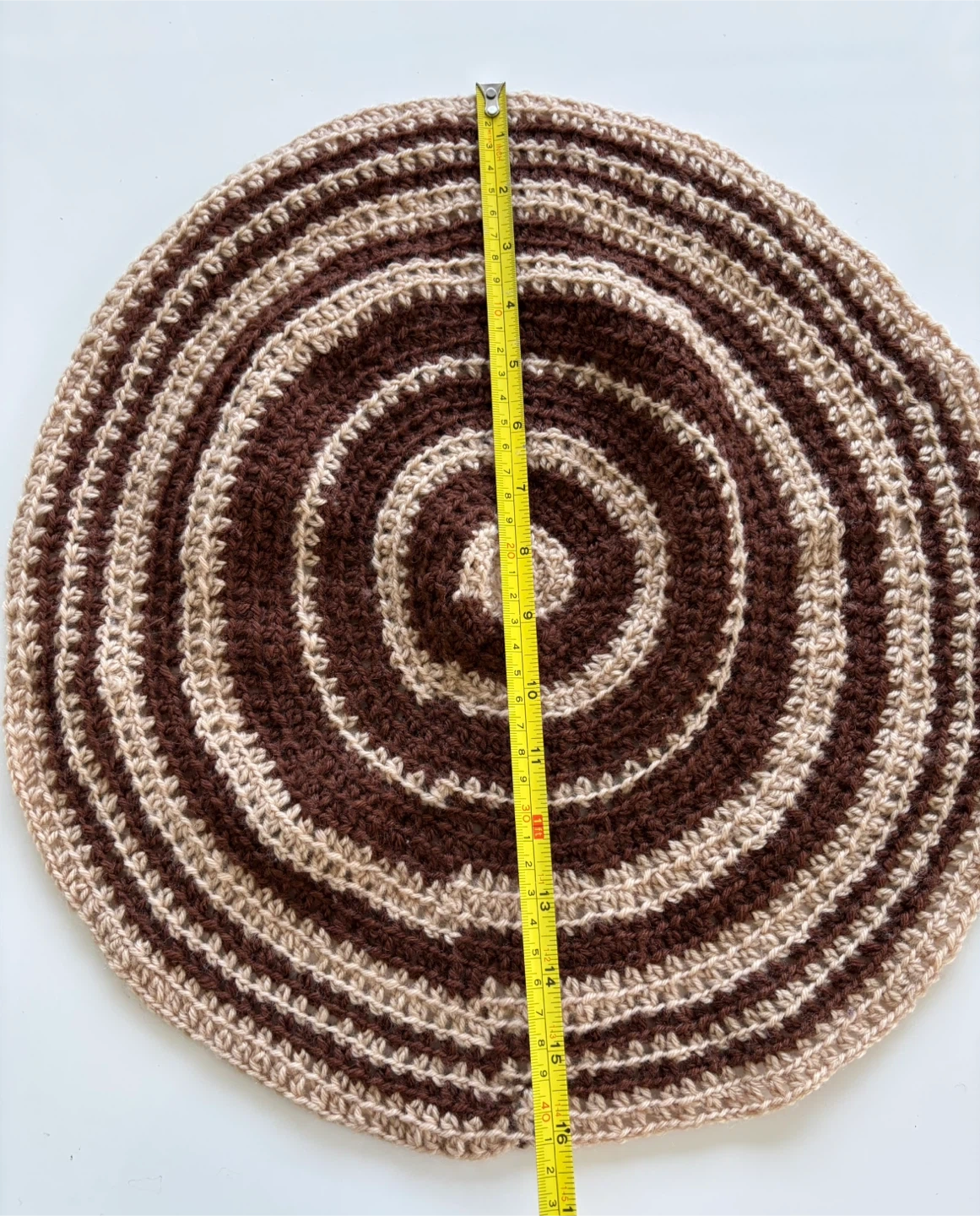 There are 5 handmade crochet rugs with a concentric circle design. They are made of yarn in brown and beige tones. Three of them measure approximately 16β in diameter, one measures 19β and a smaller one 15β in diameter.