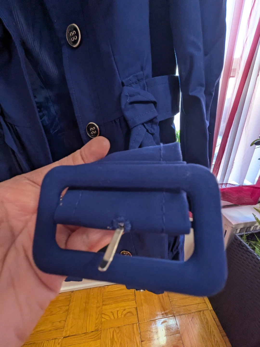 This is a navy blue trench coat from The Limited. It's a size medium and features decorative button details on the sleeves and front. The coat comes with a matching fabric belt to cinch the waist.