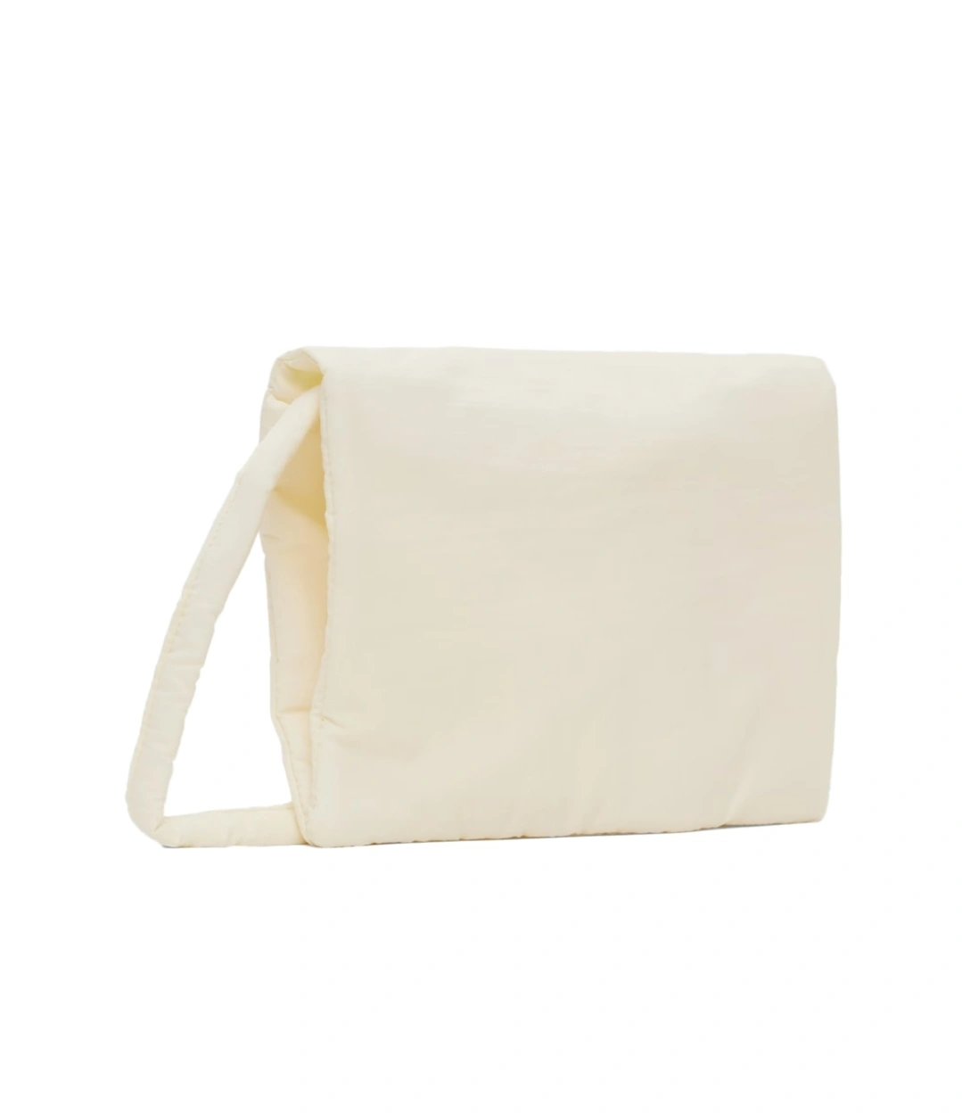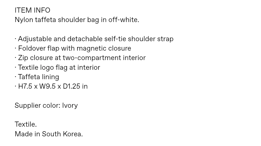 Nylon taffeta shoulder bag in off-white. Adjustable and detachable self-tie shoulder strap. Foldover flap with magnetic closure. Zip closure at two-compartment interior. Textile logo flag at interior. Taffeta lining. H7.5 x W9.5 x D1.25 in. Supplier color: Ivory. Textile. Made in South Korea.