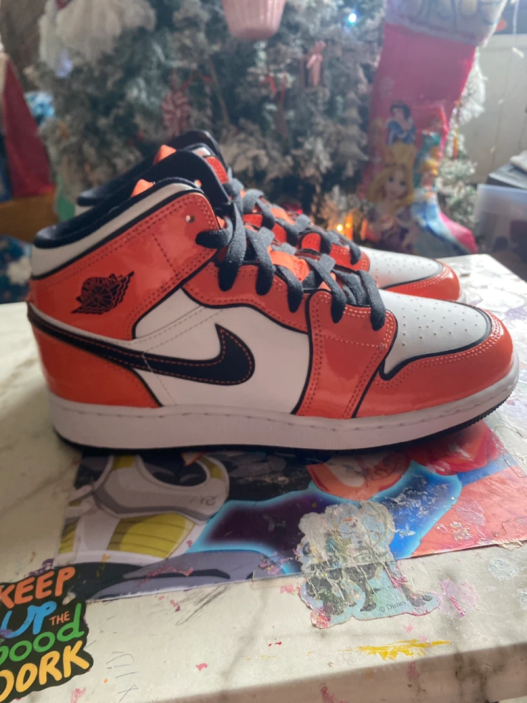 Selling a pair of Nike Air Jordan 1 Mid sneakers in orange and white. They're in great condition and ready for a new owner!