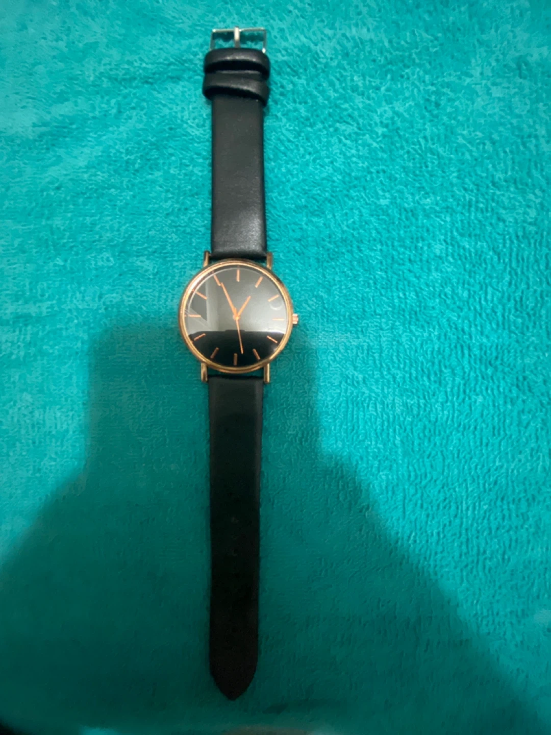 This is a black leather strap watch. It features a rose gold-toned case and a black dial. The strap is made of genuine leather. It's a simple and stylish accessory.