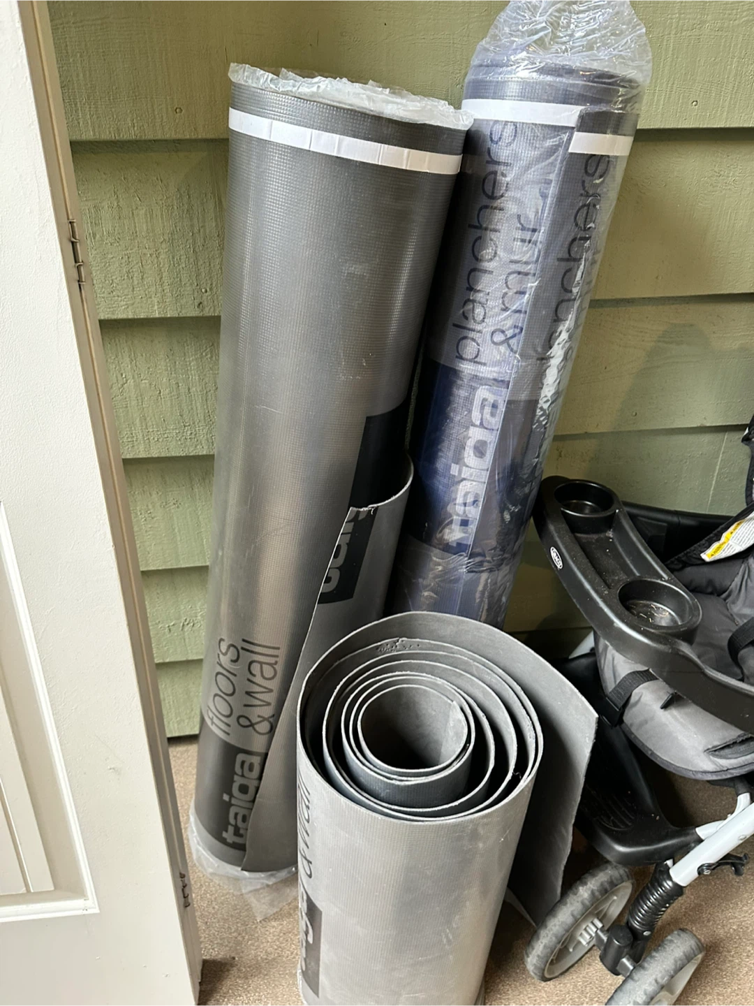 Selling HOME BUILDER Luxury Vinyl Tile/Plank Flooring Underlay, 100 sq ft. Model #PX-56100 unopened and then an almost full roll and then some random cuts. Originally priced at $82.99 a roll
