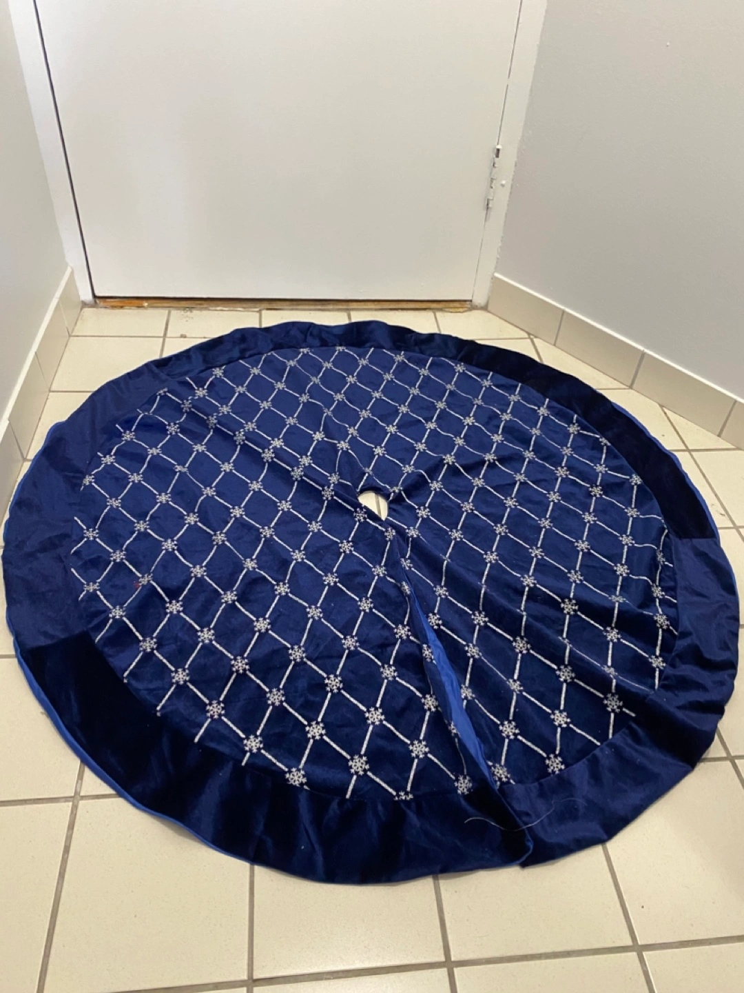 Beautiful tree skirt in a rich blue colour. A white embroidered pattern adorns the surface. The edge appears to have a dark, textured material. Putting this skirt under a tree can bring a sense of peace during the holidays.