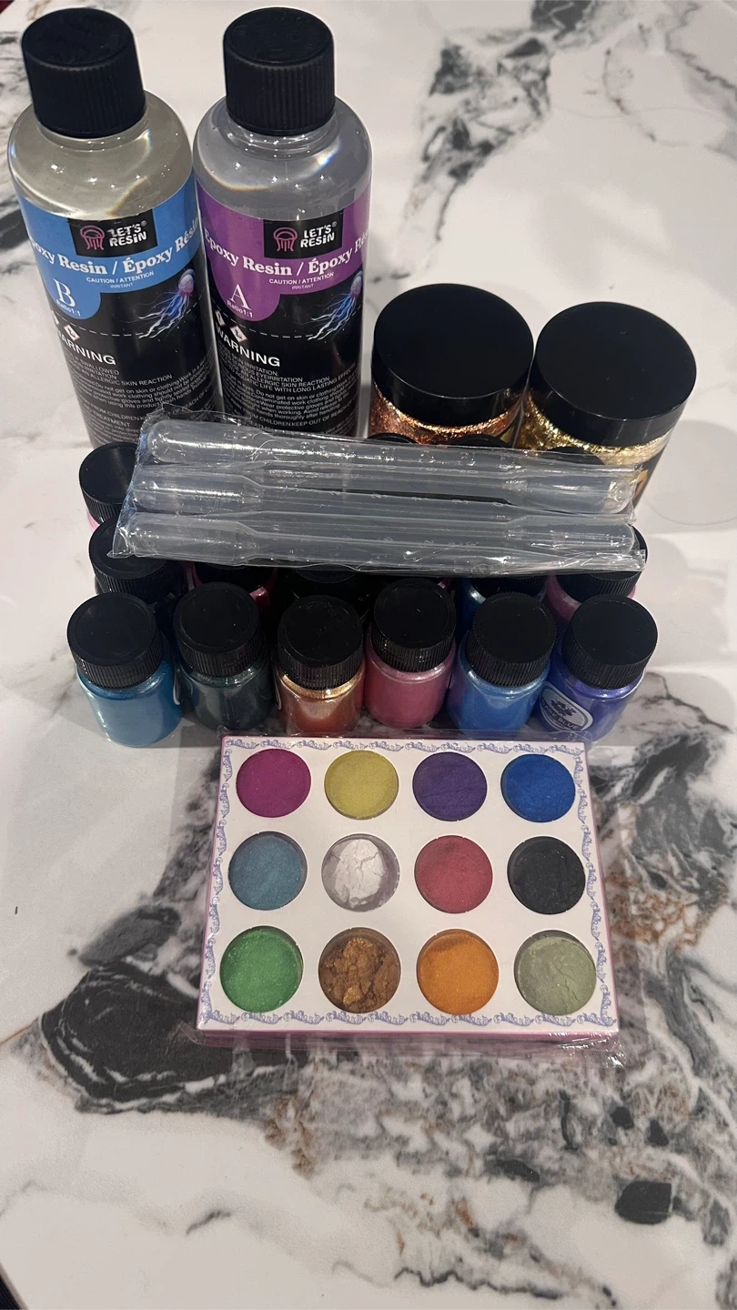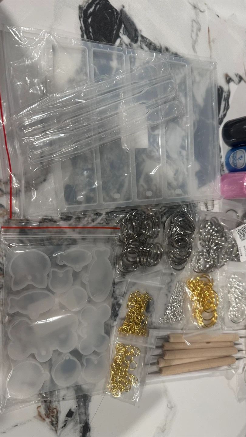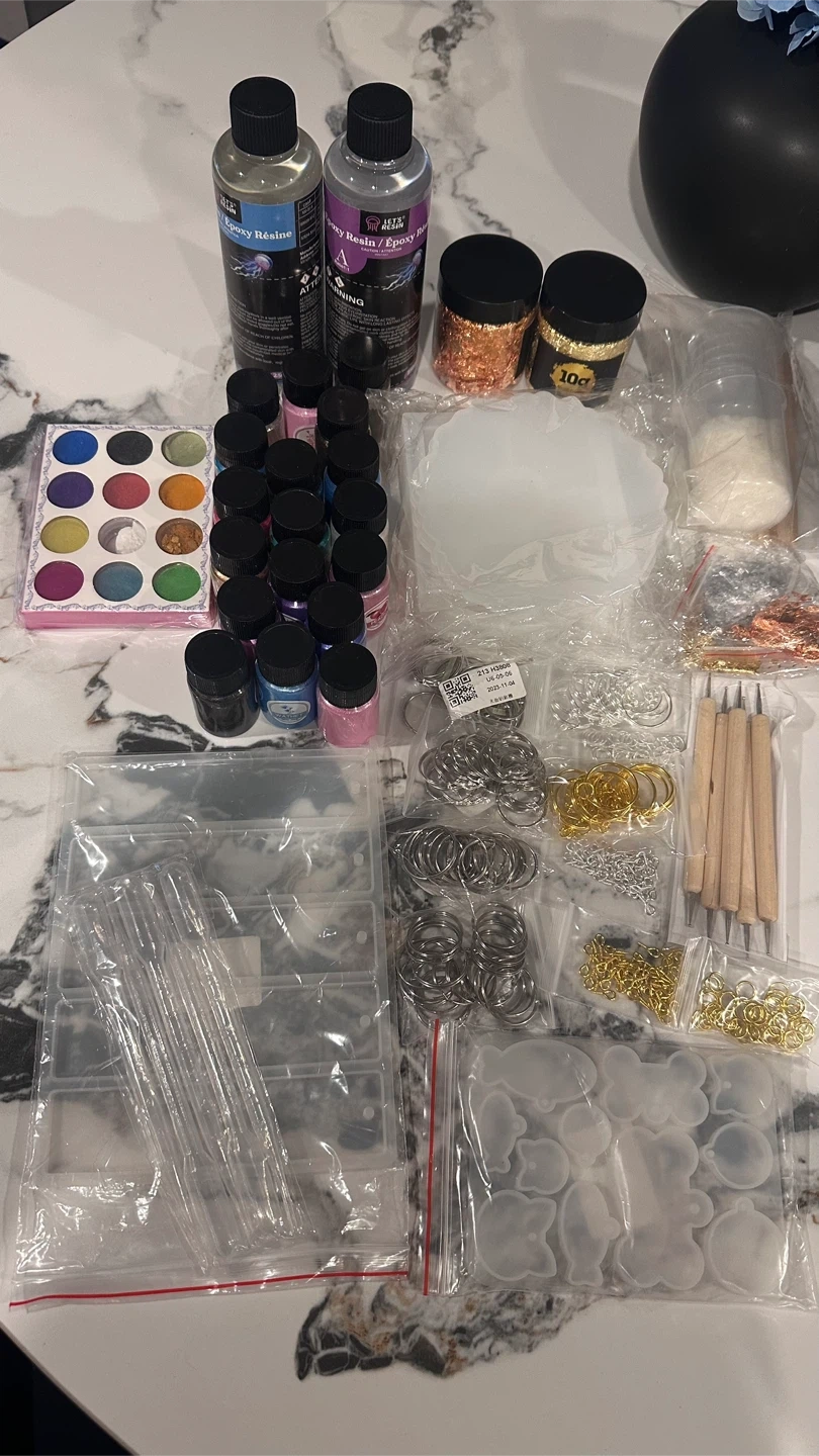 This comprehensive craft kit includes two bottles of Lets Resin Epoxy Resin (A and B), various colours of mica powder, gold foil flakes, and multiple silicone moulds for creating jewelry and other items. It also comes with mixing cups, stirring sticks, and findings to complete your projects. Perfect for crafters looking to explore resin art!