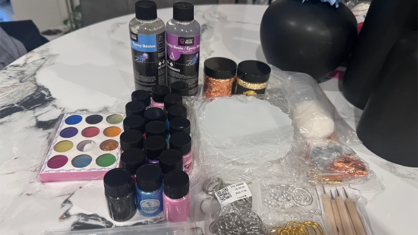 This comprehensive craft kit includes two bottles of Lets Resin Epoxy Resin (A and B), various colours of mica powder, gold foil flakes, and multiple silicone moulds for creating jewelry and other items. It also comes with mixing cups, stirring sticks, and findings to complete your projects. Perfect for crafters looking to explore resin art!