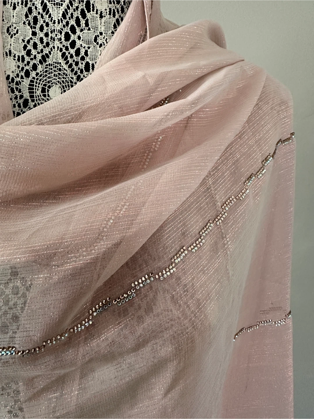 A lovely light pink scarf with rows of sparkling embellishments. It's lightweight and has a delicate shimmer. This scarf adds a touch of elegance to any outfit!