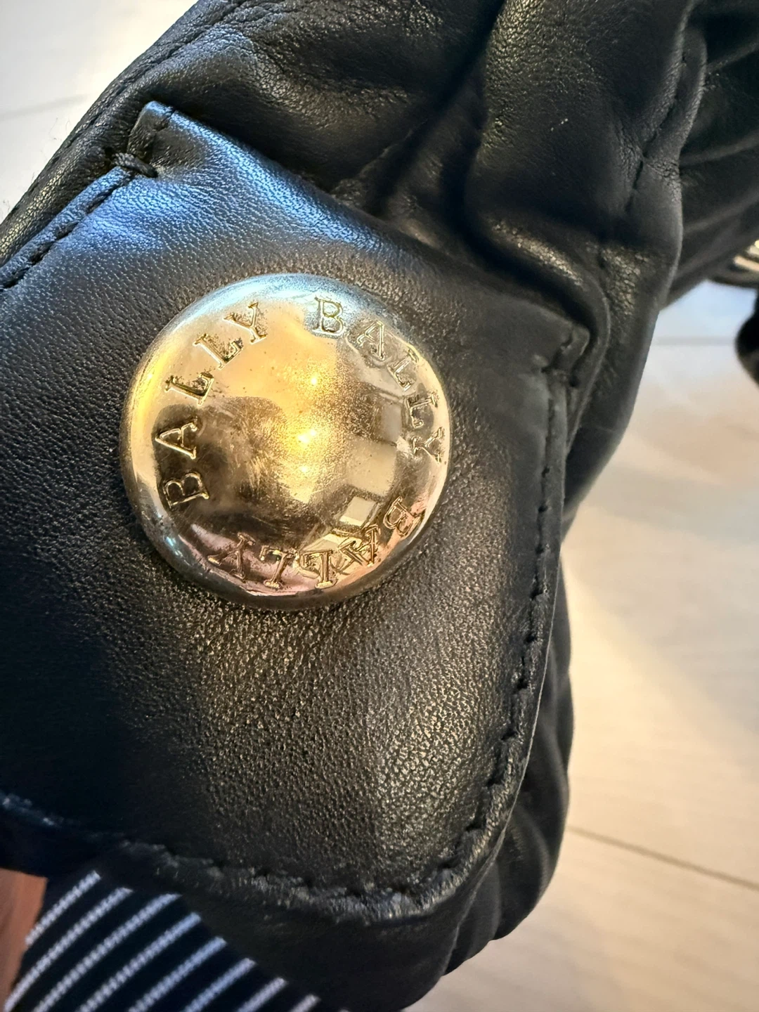 High quality. This is a black leather handbag by Bally. It features ruched detailing and gold-tone hardware. The interior has a branded plaque.