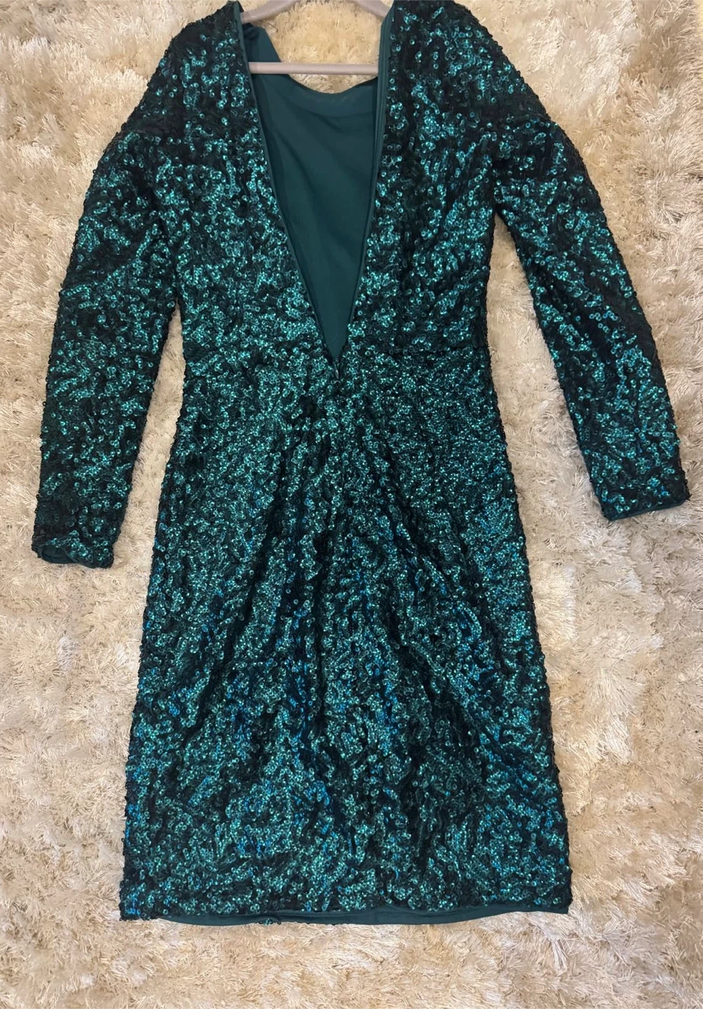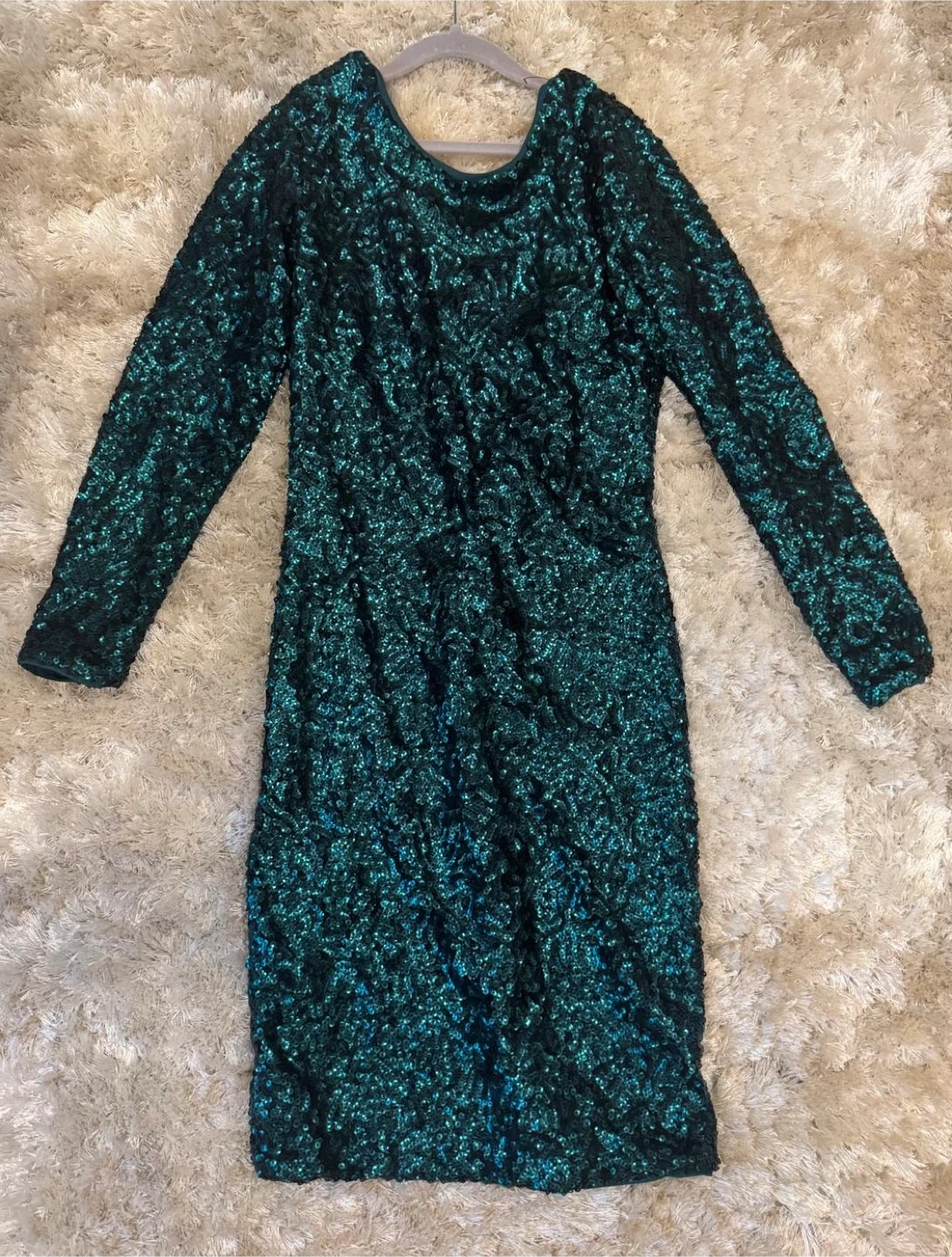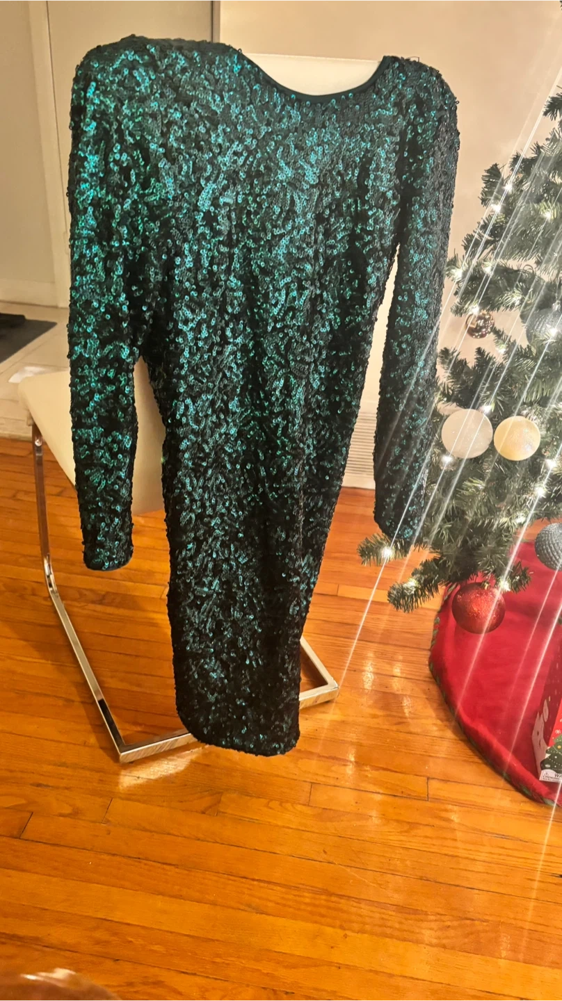 Here's a beautiful sequin dress with long sleeves! It's a stunning piece that's sure to turn heads. The dress is a vibrant green color and the sequins add a touch of sparkle and glamor to any occasion